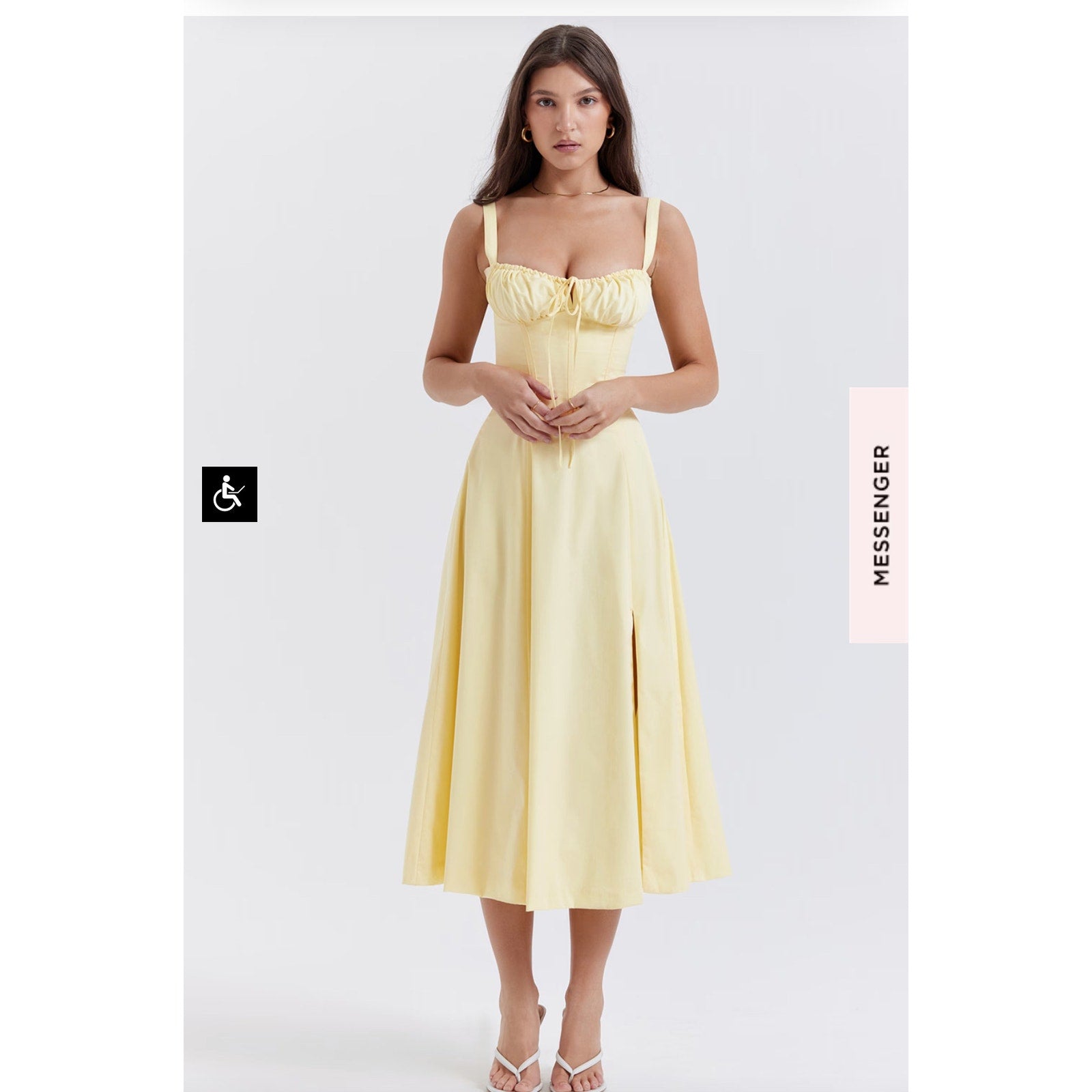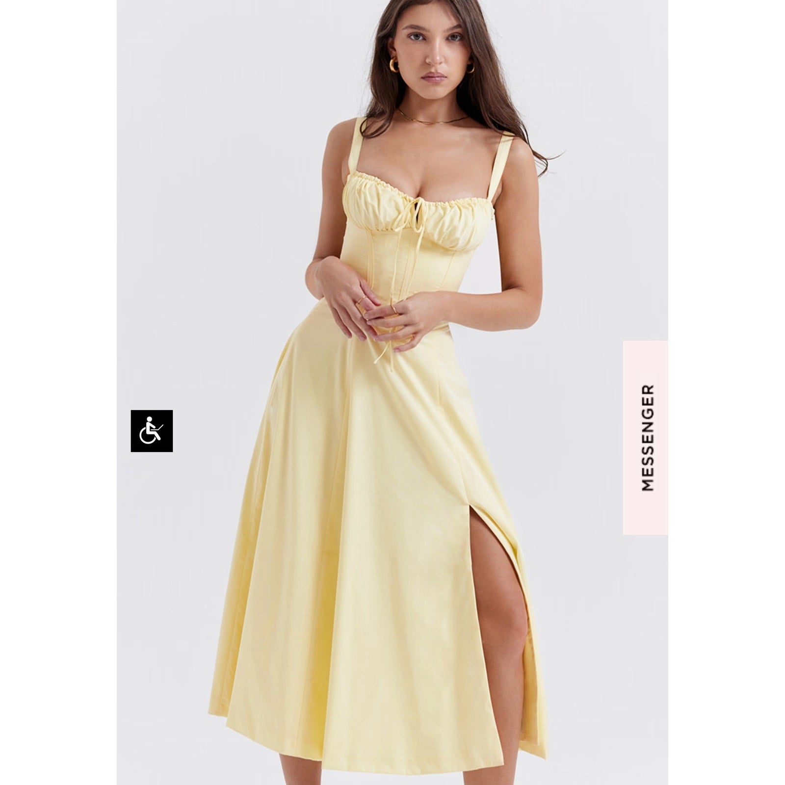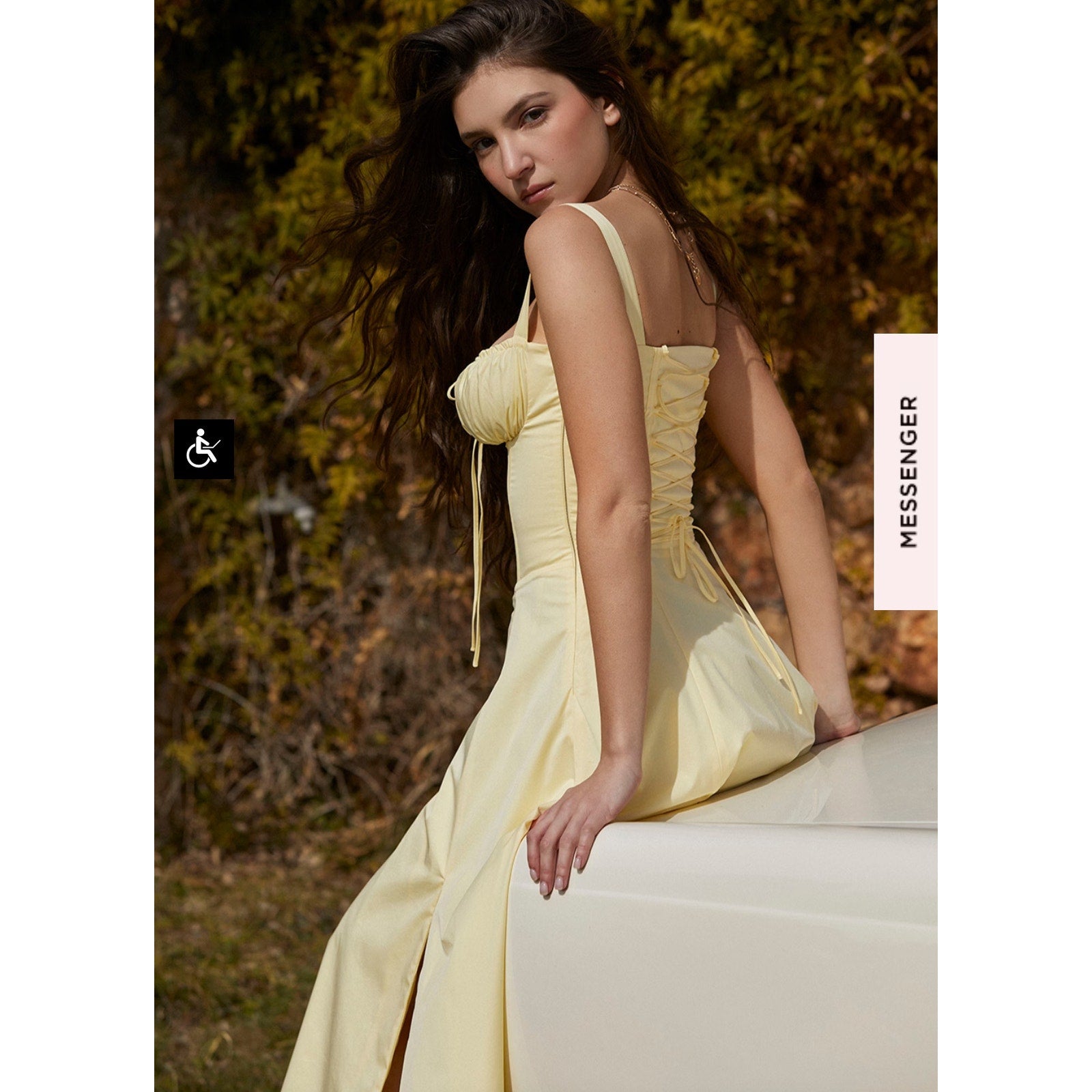 You'll feel ultra feminine in our 'Carmen' dress that's the perfect match for spring and summer garden parties. It's cut from stretch cotton in a gorgeous buttercup hue and has a corseted bodice to cinch the fit with a beautiful lace up back. The gathered bust has a drawstring tie and the side split adds a little sexiness to reveal a flash of leg.