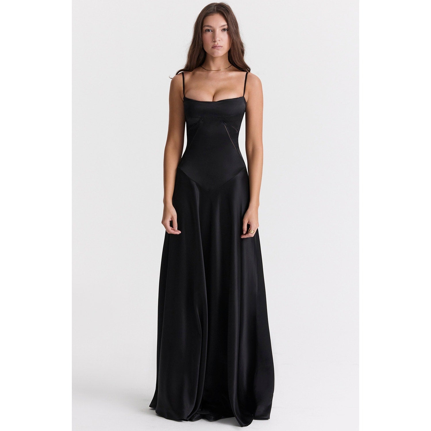 The bodice has a curved hem that sits below the natural waistline and we're loving the corset inspired lace up back for a vintage feel. The skirt skims over the hips, falling freely to the floor and 'Anabella' would not be complete without tonal heels like our 'Paris' in black suede for glamorous events. The 'Regular Cup' option suits cup size A-C whilst the 'Bigger Cup' option suits cup size D-E.