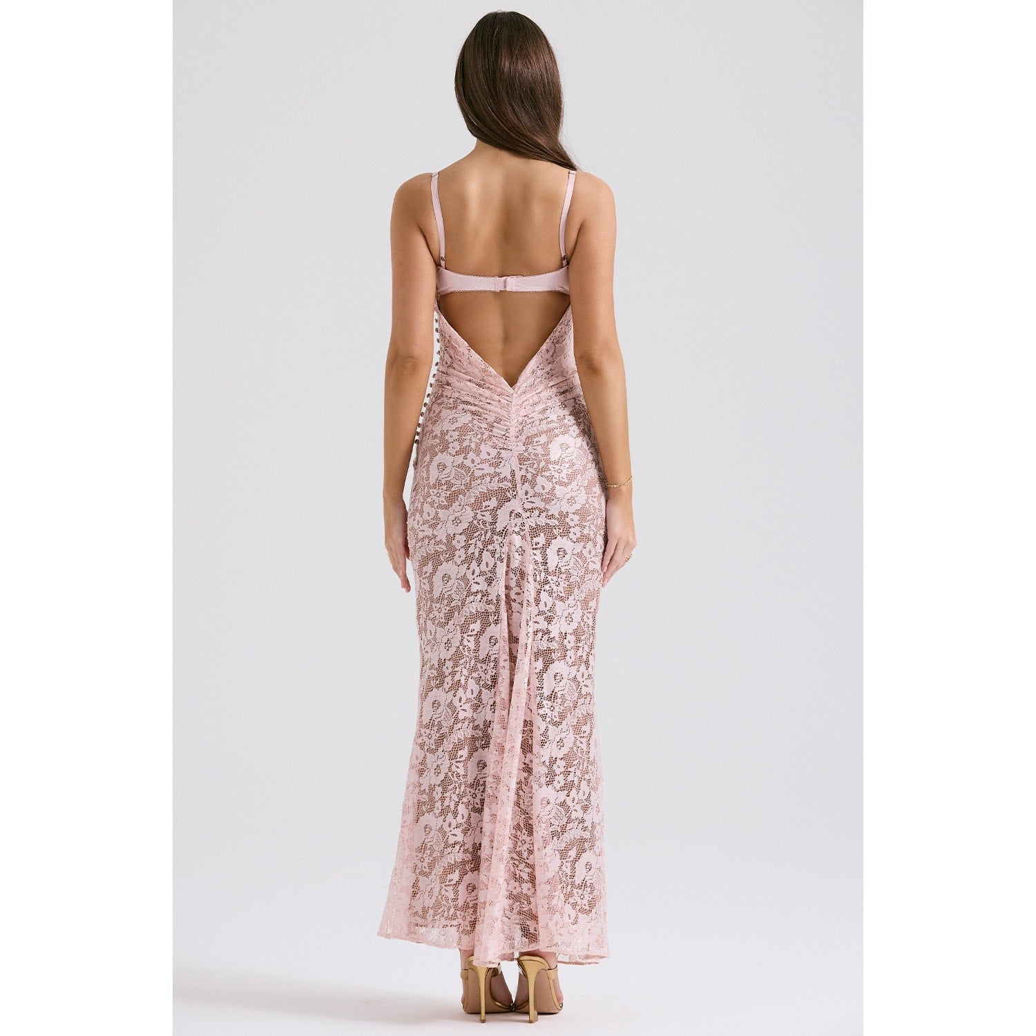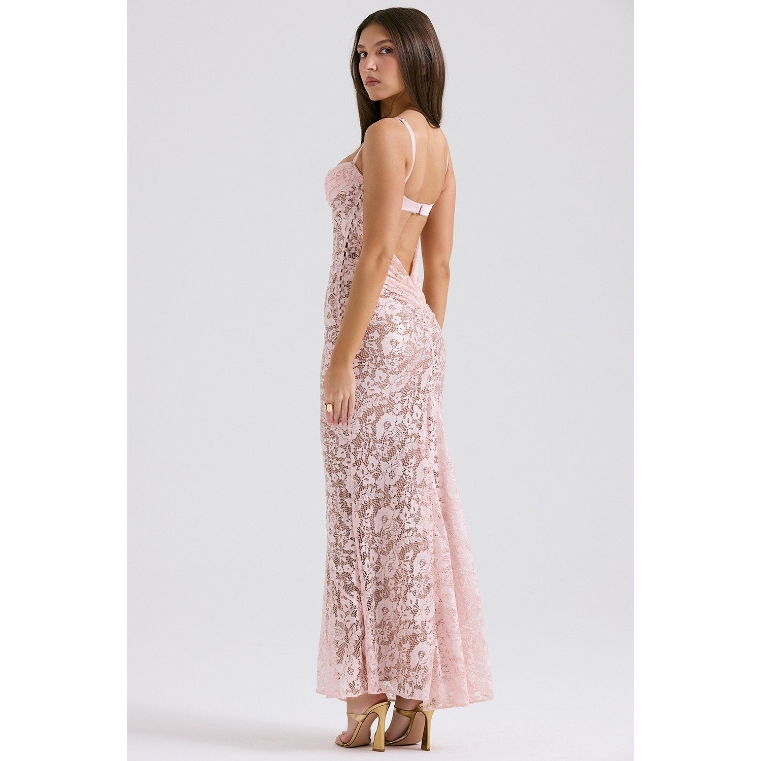 House of CB Azzurra rose pink lace godet gown