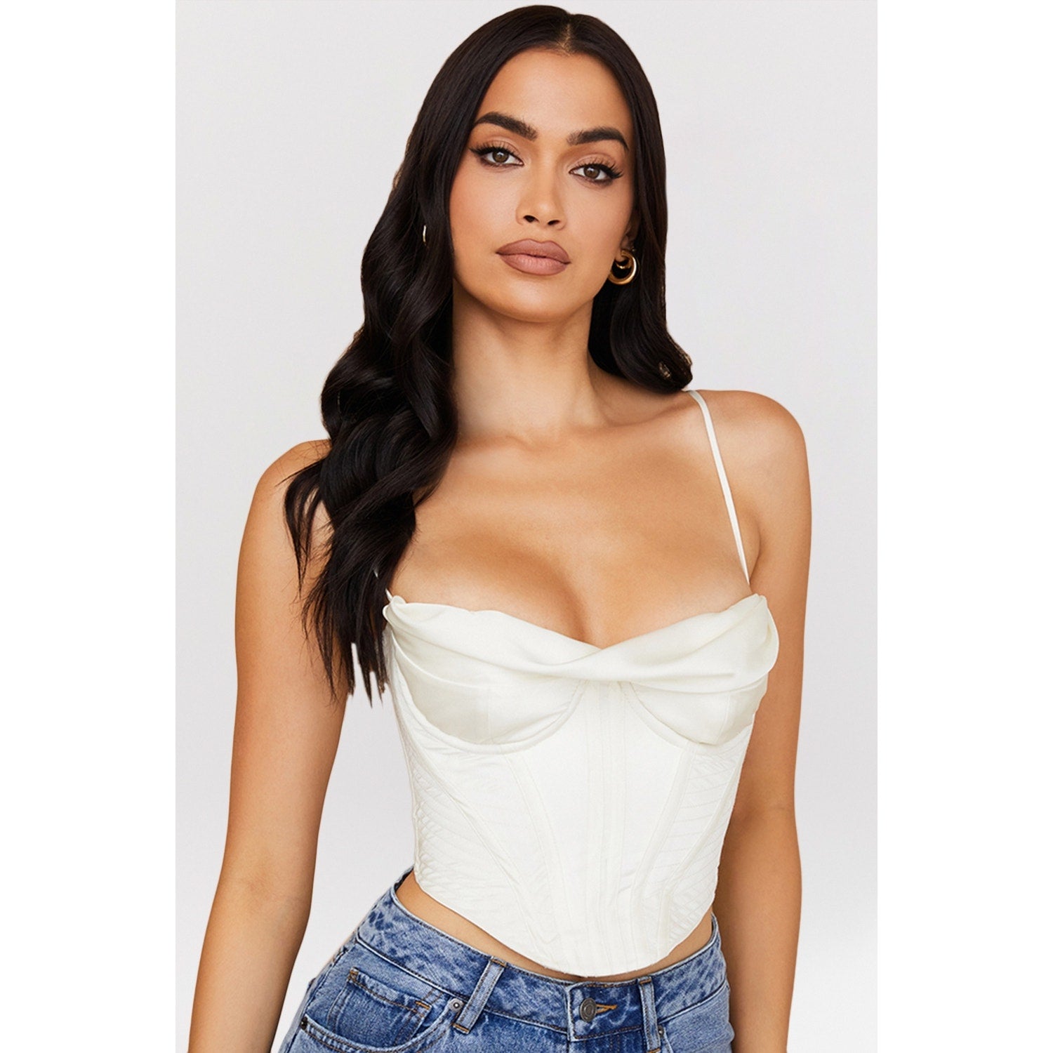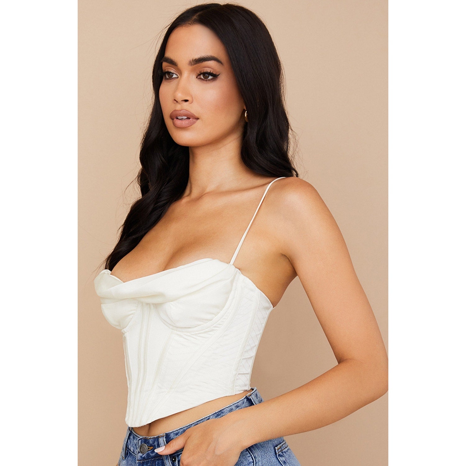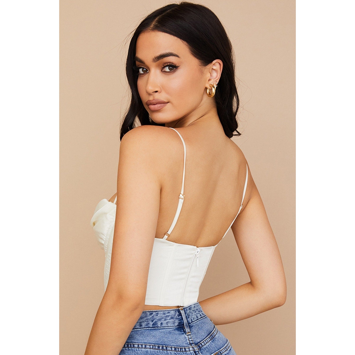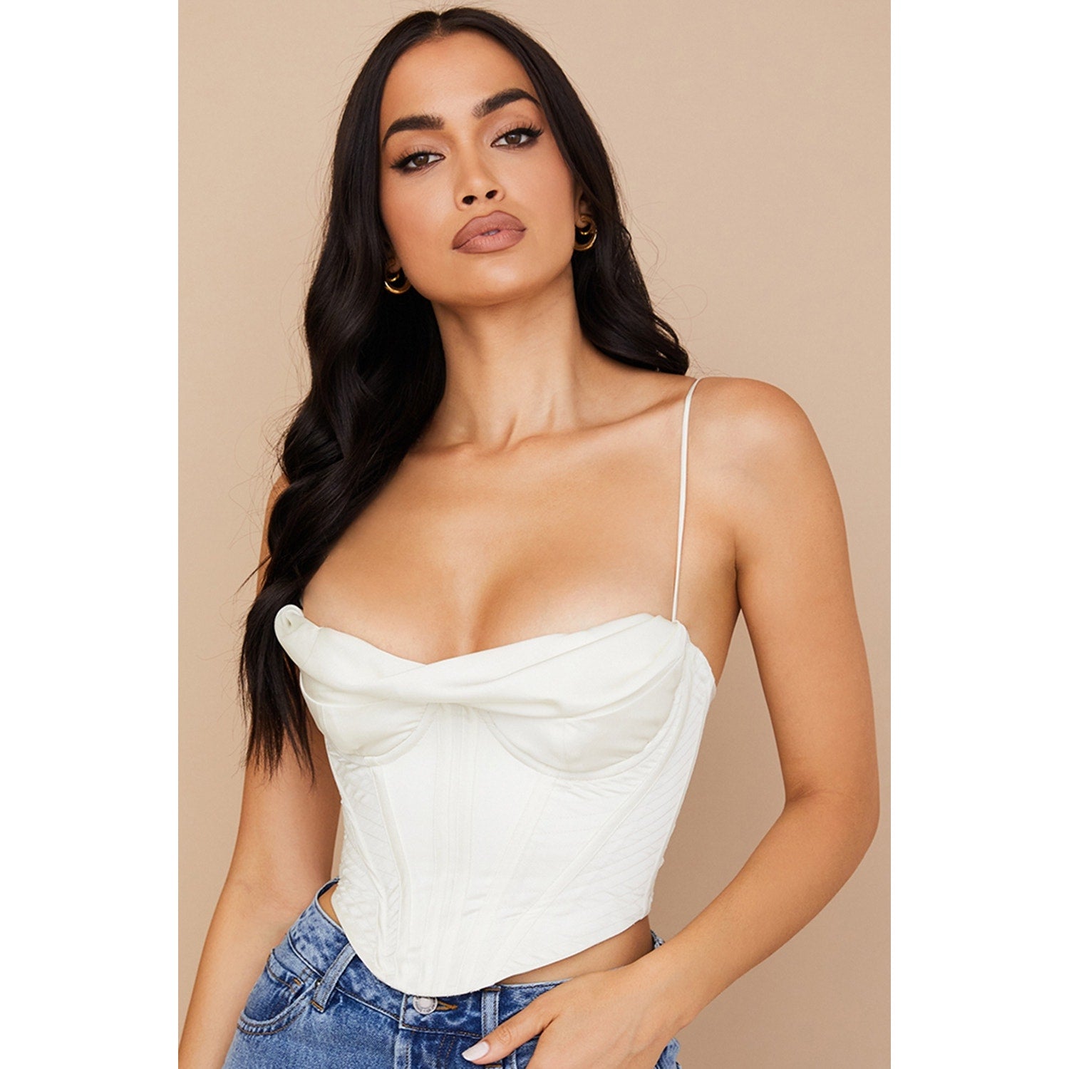 We love the beautifully draped neckline and pretty half cups that are softly lined and underwired for full support and ultimate uplift. The slim spaghetti straps are adjustable for the perfect fit and it has a zip to the back for easy on. Compliment the flattering cropped hem with a high rise denim like our 'Yara' Vintage Fit High Waist Jeans for a pretty summer date night. The 'Regular Cup' option suits cup size A-C whilst the 'Bigger Cup' option suits cup size D-E. As corsets are designed to fit snugly, we recommend sizing up if you are between sizes.