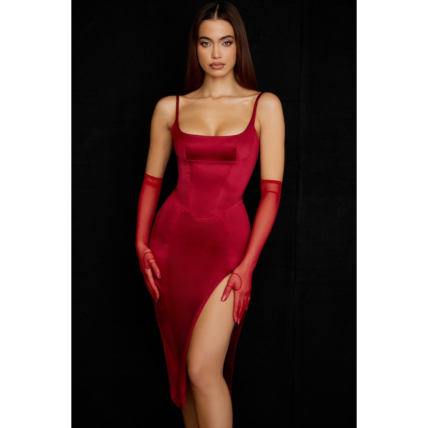 We love the thigh high split to show a flash of leg and the figure defining seams for a sultry look. It is fully lined for comfort and has a zip to the back for easy on. Wear yours with our 'Bella' mules in black and our 'Esther' opera-length red gloves for those glam functions and events. The 'Regular Cup' option suits cup size A-C whilst the 'Bigger Cup' option suits cup size D-E.