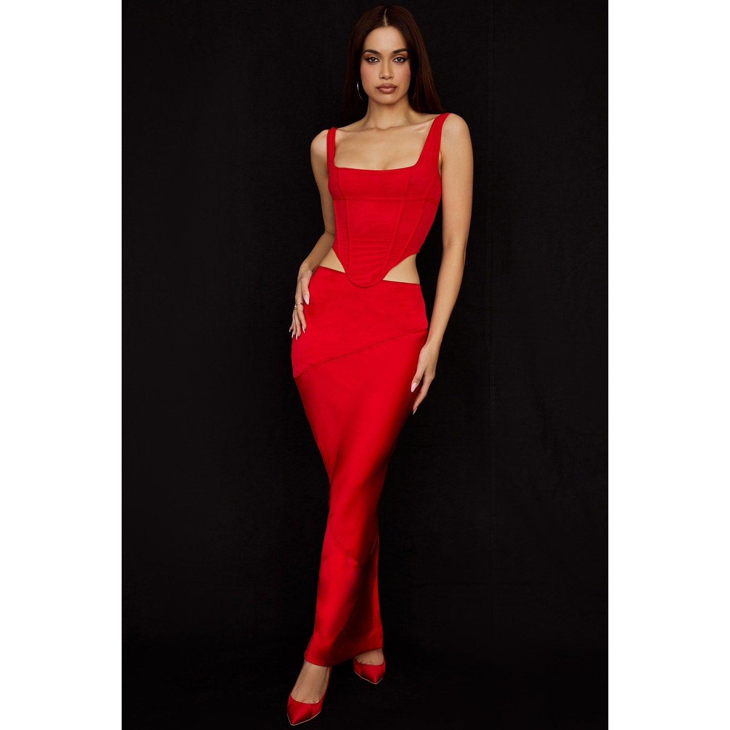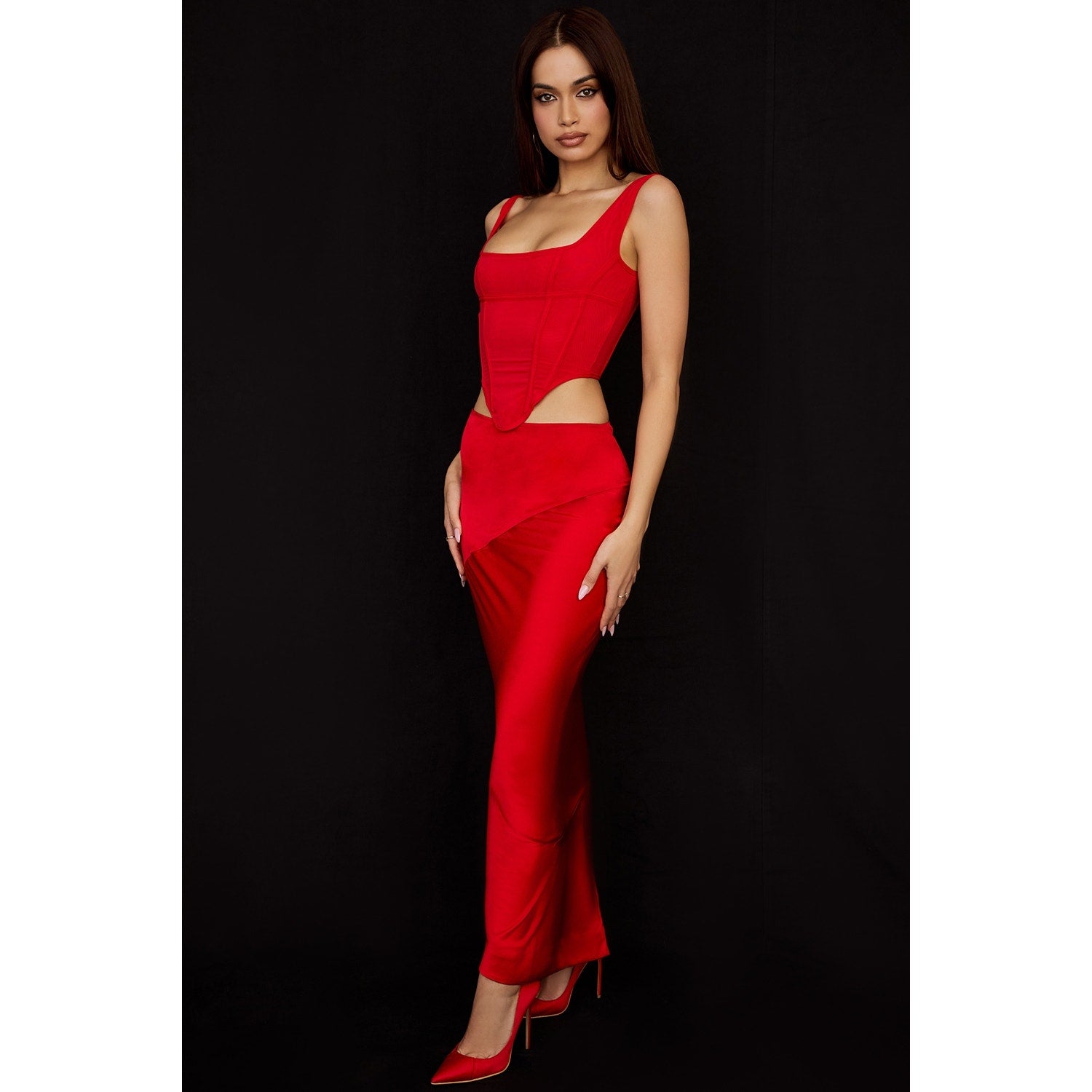 House of CB Colette Scarlet Satin Low Waist Midi Skirt