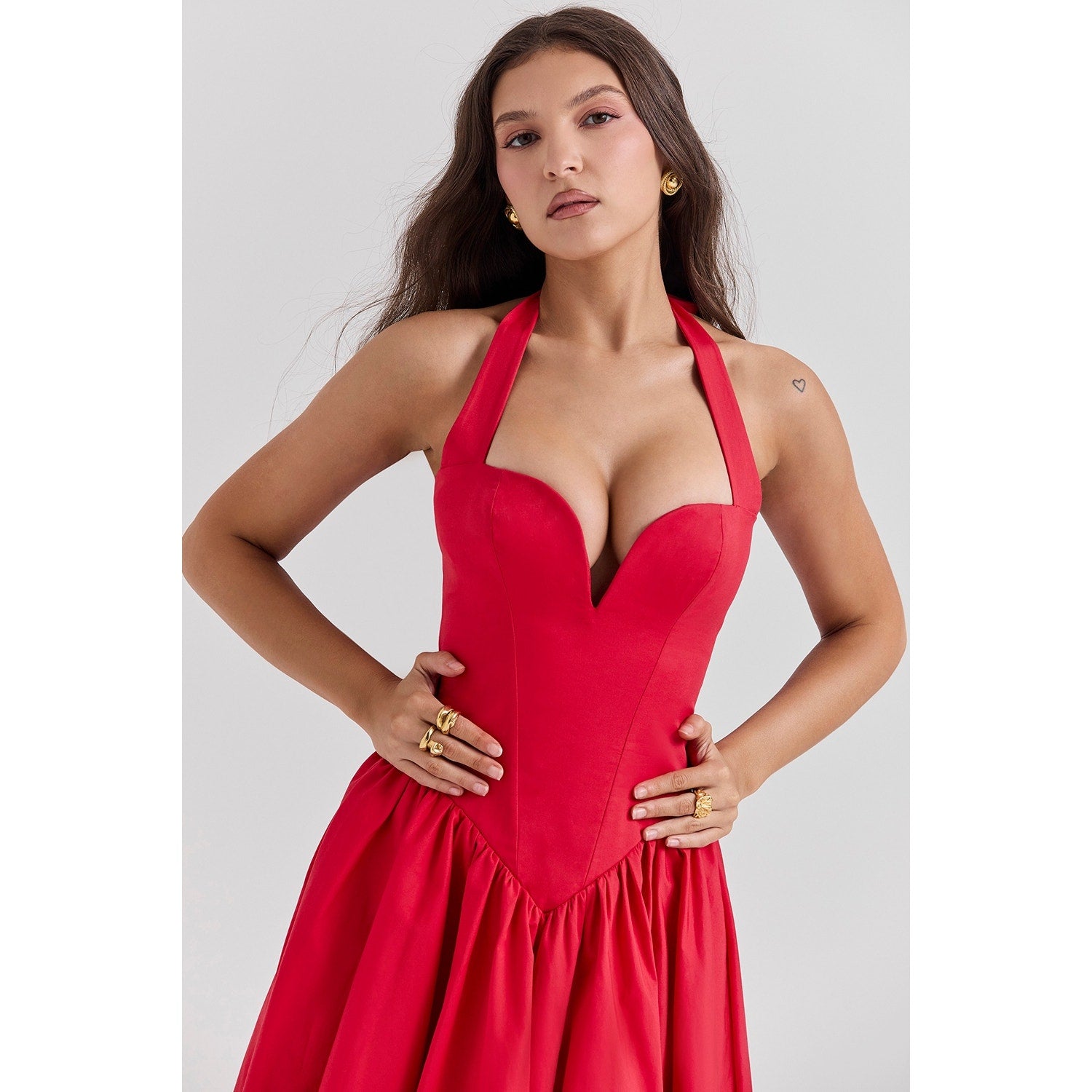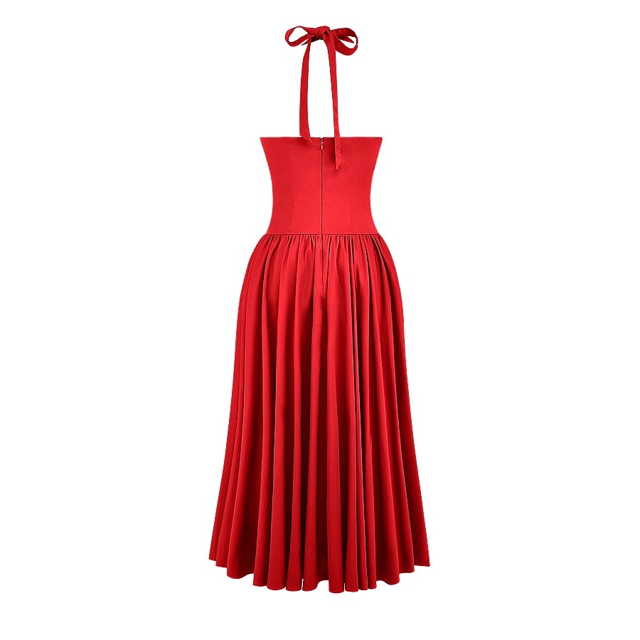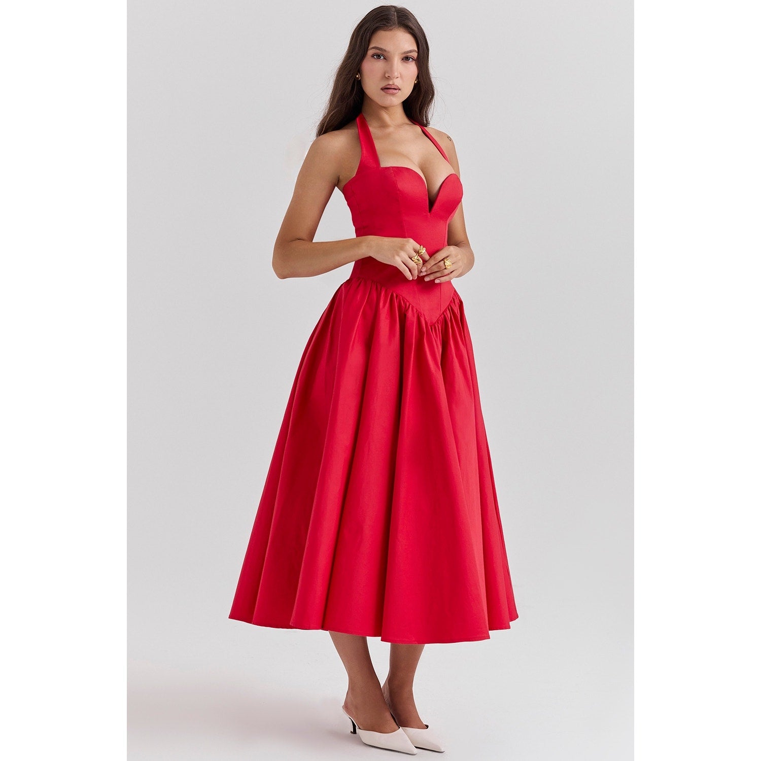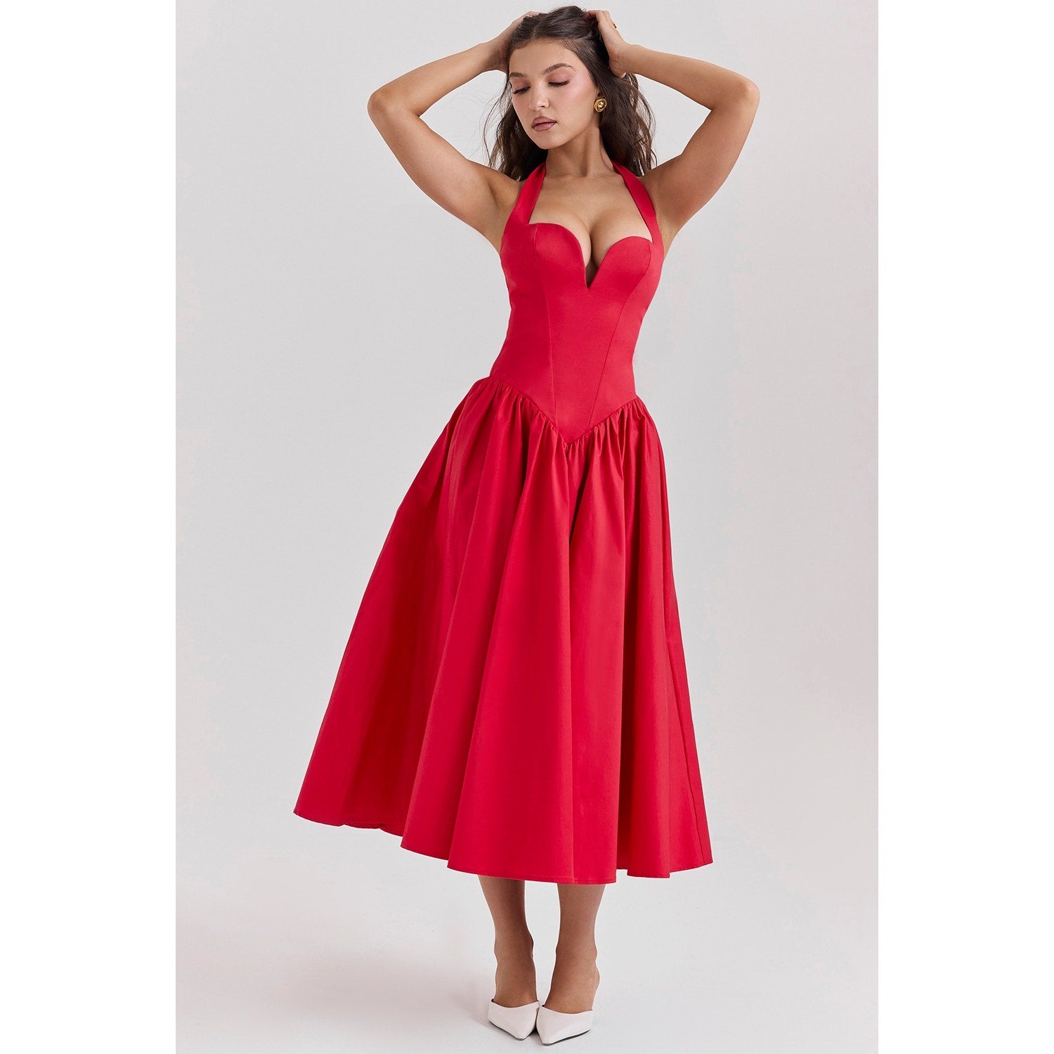 Elegance, class and romance, are all adjectives to describe our Coquette' midi dress. It's made from a soft stretch twill and designed to flatter your figure with a pretty sweetheart bodice that creates a dramatic plunge neckline. The wide halter straps self tie at the back of the neck for the perfect fit and 'Coquette' turns to reveal to a low-cut back.