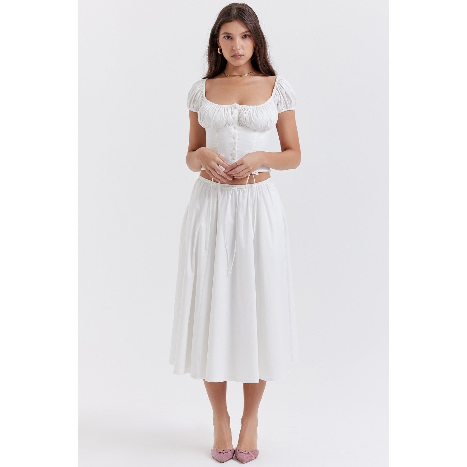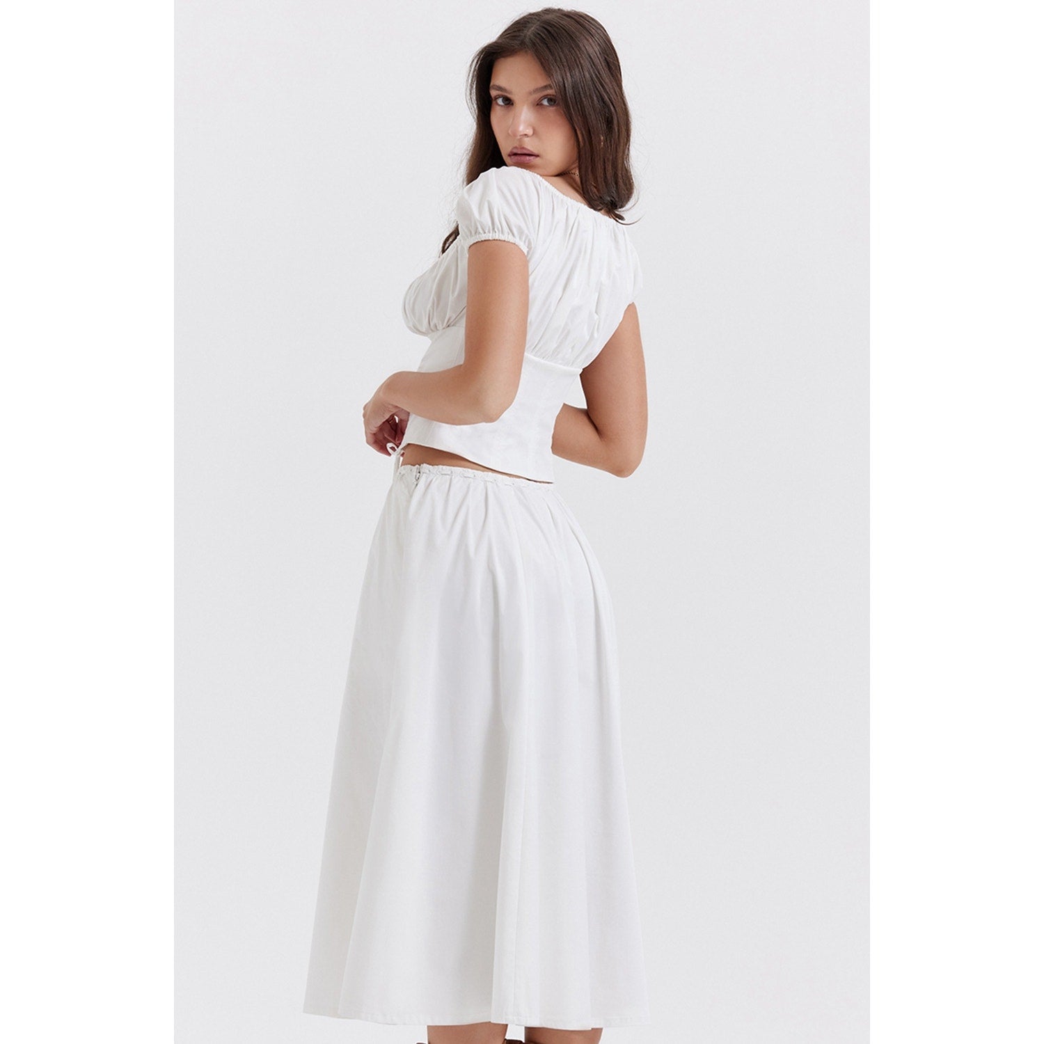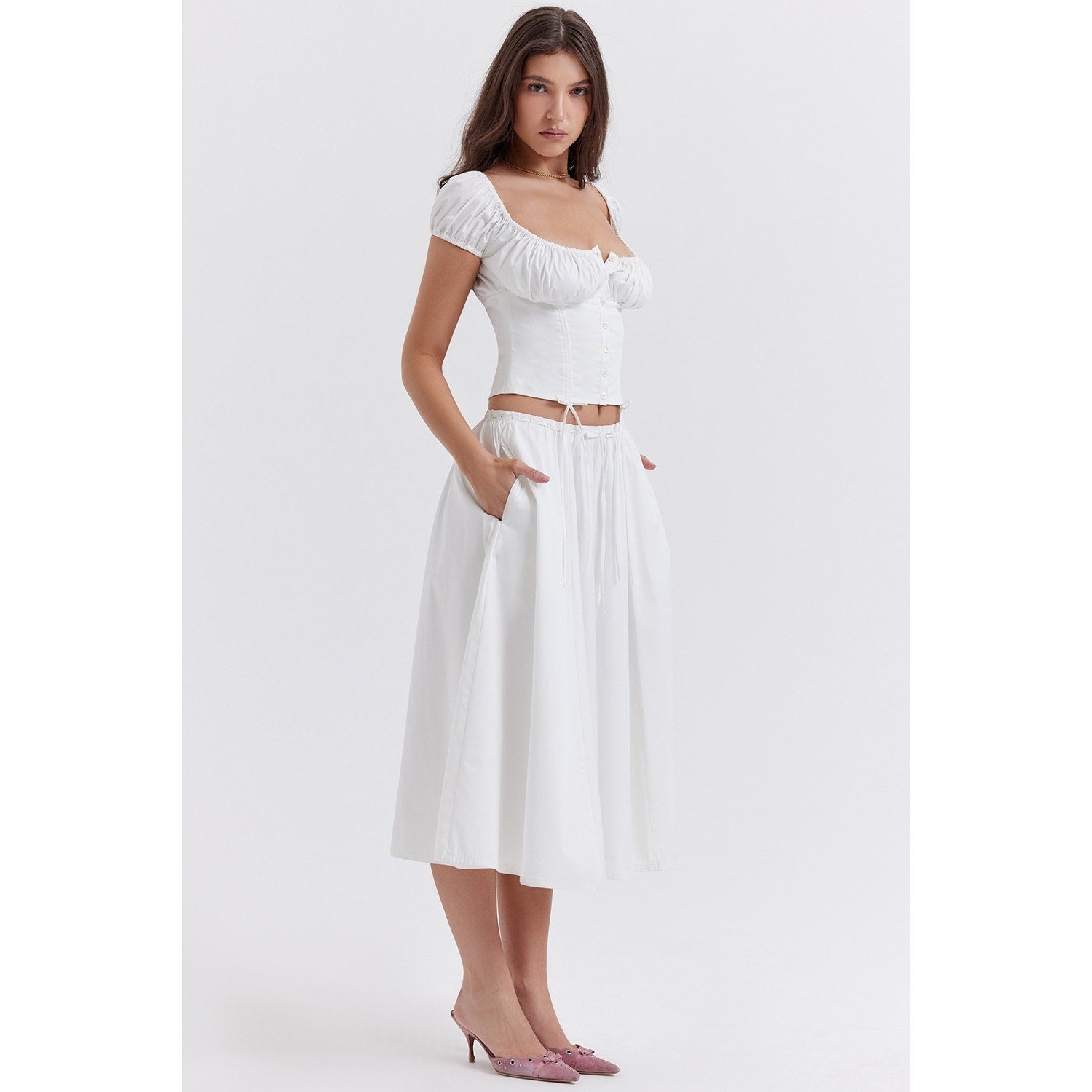 'Cora' has a feminine and floaty silhouette with side pockets and is fully lined for comfort. Wear yours with our 'Kitty' top and mid heels like 'Lola' in white.