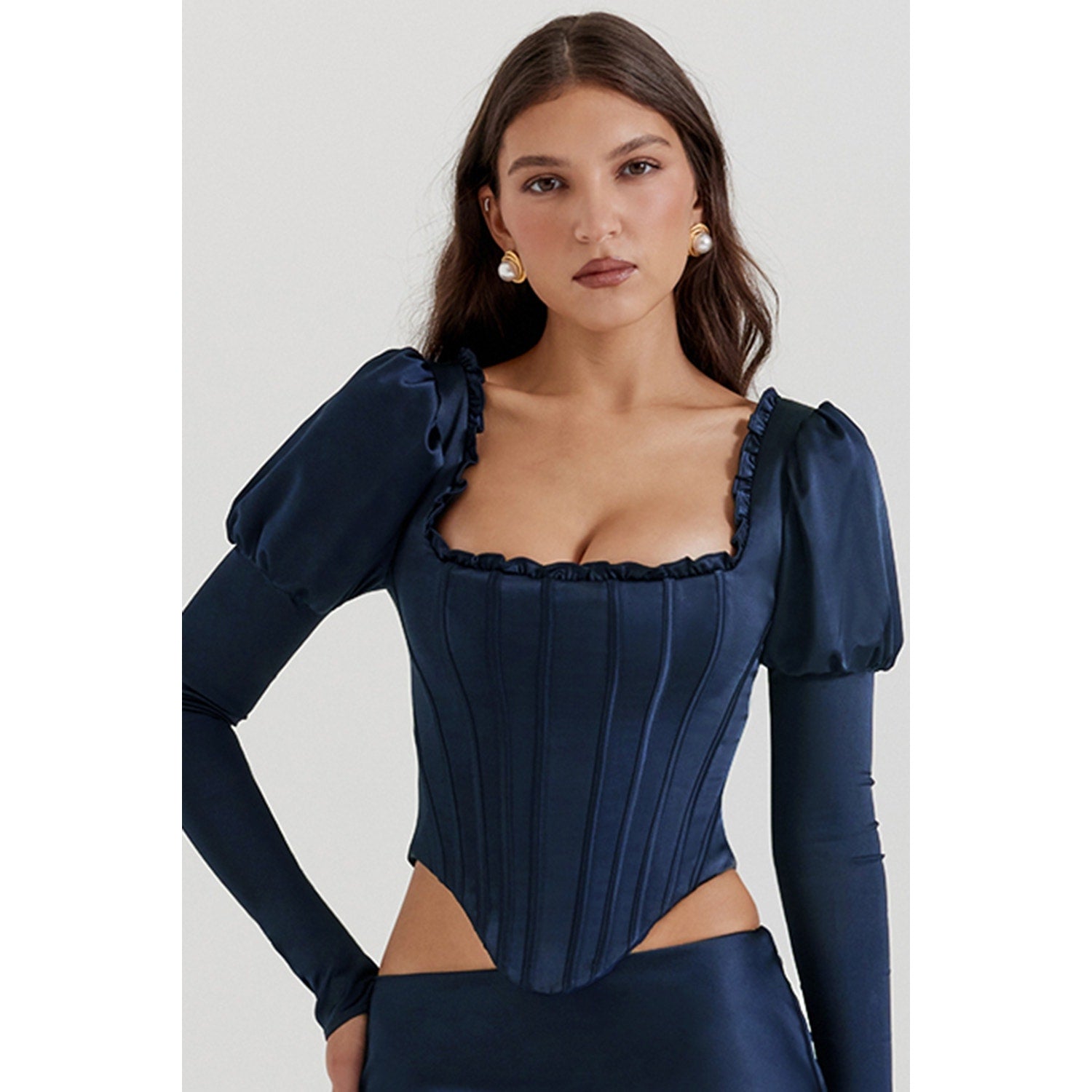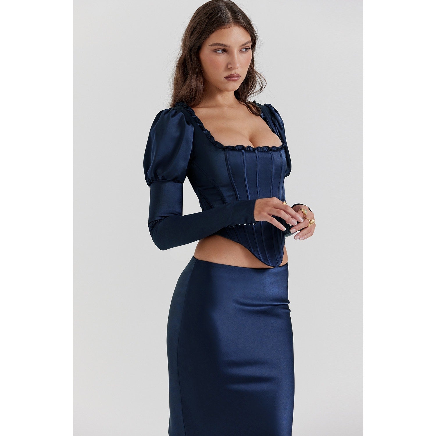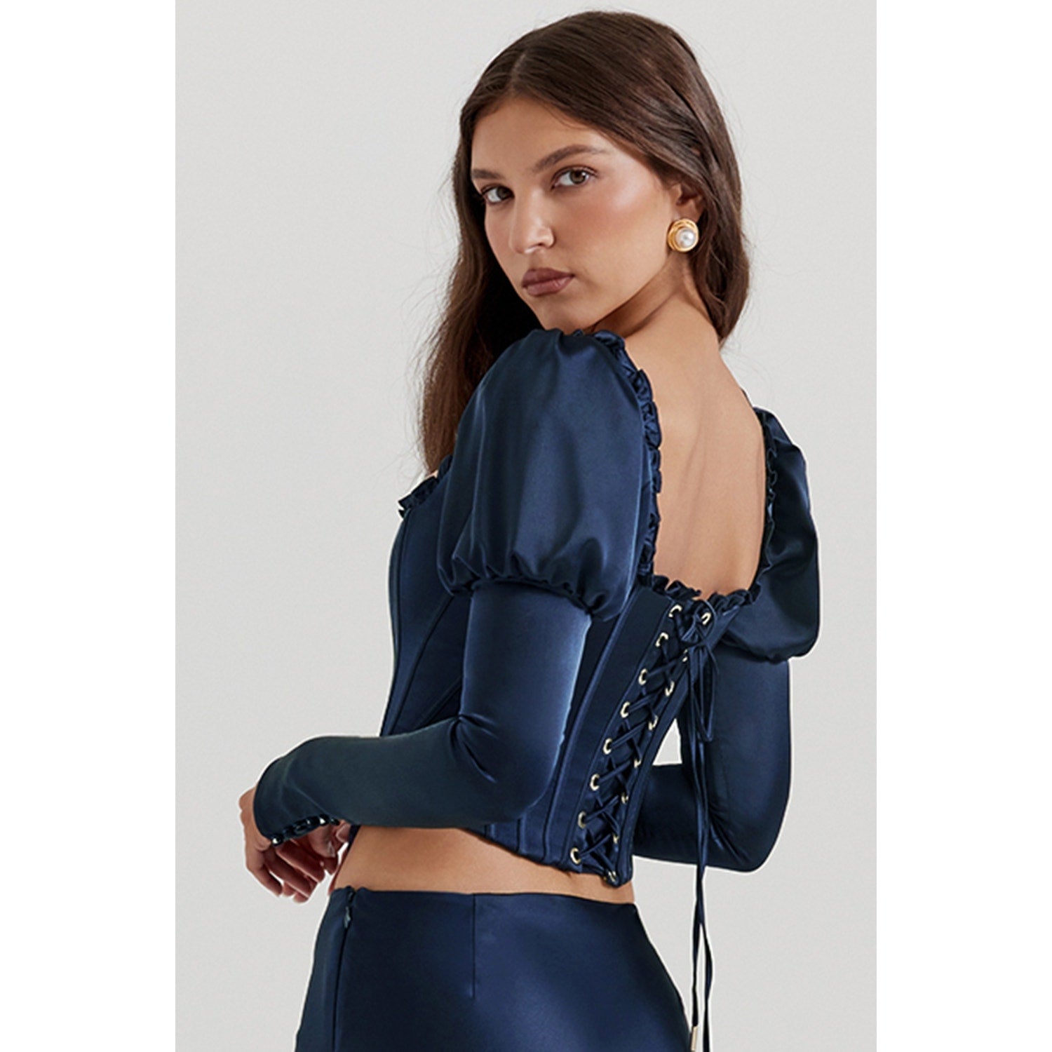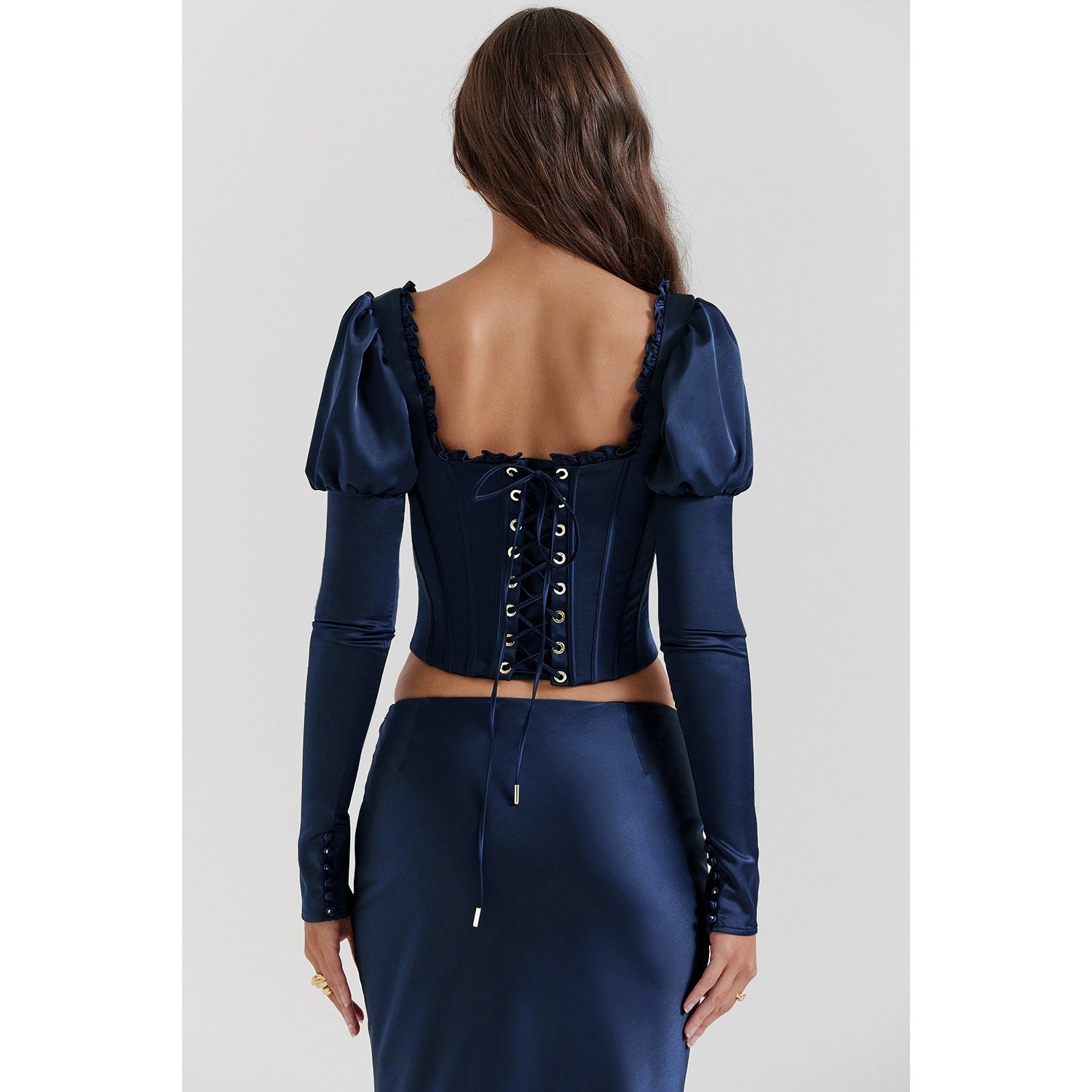 Designed with sculptural details and pretty puff sleeves, 'Dana' has a romantic feel with a vintage edge. Cut from lustrous stretch satin, it's fitted with internal boning to cinch your waist and shape your bust. The pretty frill edging and lace up back adds to the romantic feel and 'Dana' pairs perfectly with our 'Charlene' maxi skirt.