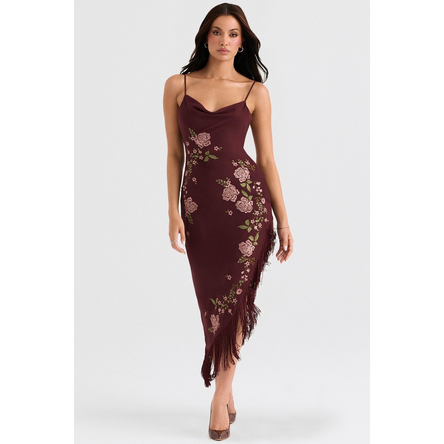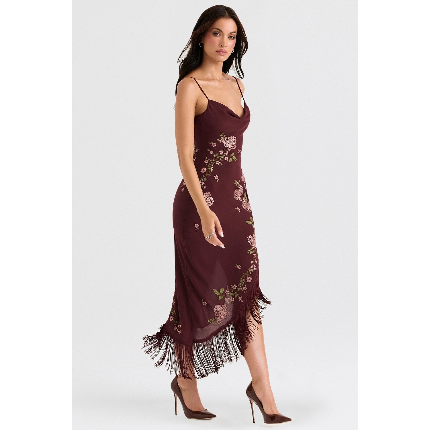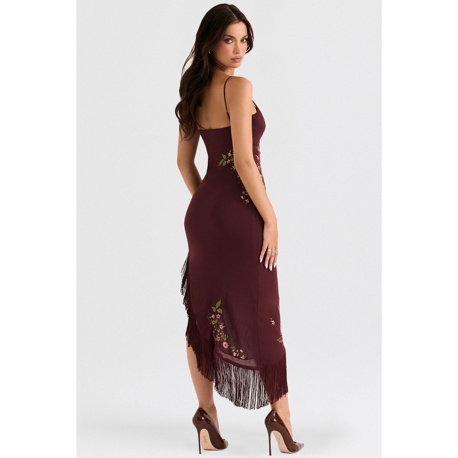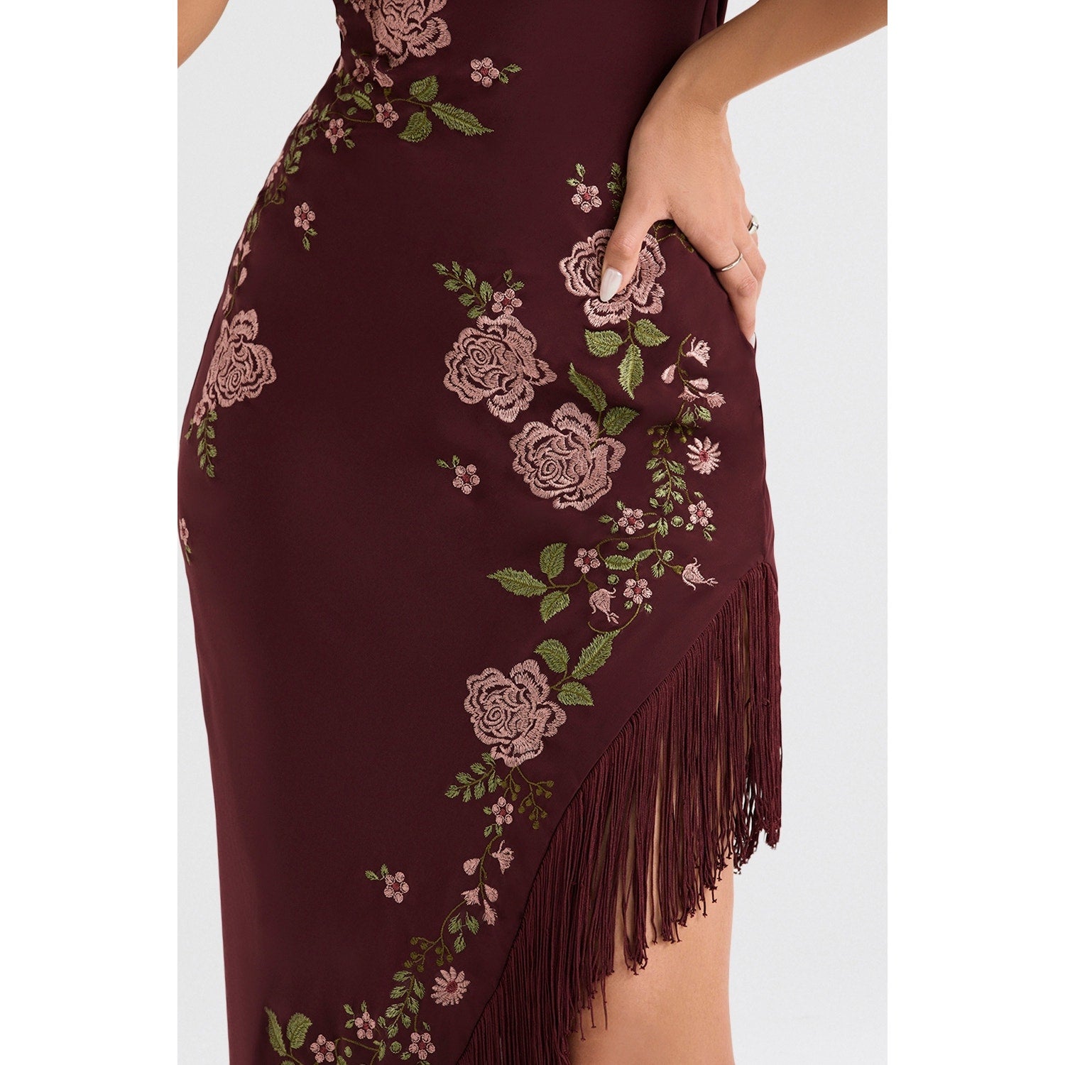 Extra special embroidery detailing make 'Eloisa' a very special dress for elevated occasions. It’s cut from georgette in wine and is trimmed with swishy fringing for an ultra feminine vibe. Designed to skim the body, 'Eloisa' is embroidered with a pretty floral pattern and we love this paired with our 'Paris' heels in brown patent for your next event. It has a zip to the left side for easy on and is suitable for any bust size as it has no cups.