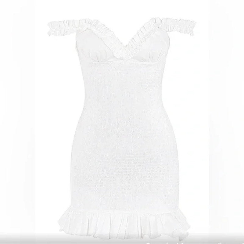 Summer dressing is made super simple with 'Evelyn'. It features shirring through the body for a figure hugging sexy fit and it's trimmed with ruffles to maintain that fresh feminine white vibe. The off shoulder cut captures that effortlessly coy sexiness that we love. Seen on Kylie Jenner.