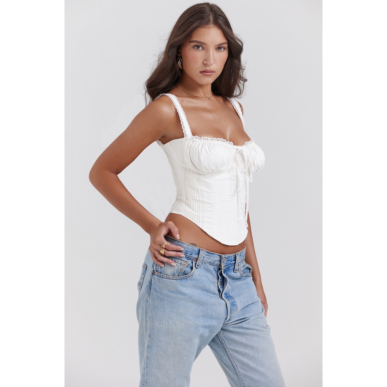 The vintage inspired lace up back defines the shape on our 'Gini' corset. It has underwired cups and the stretch cotton and corseted bodice ensures the perfect fit. The pretty lace trim makes for a feminine touch and it zips to the side for easy on.