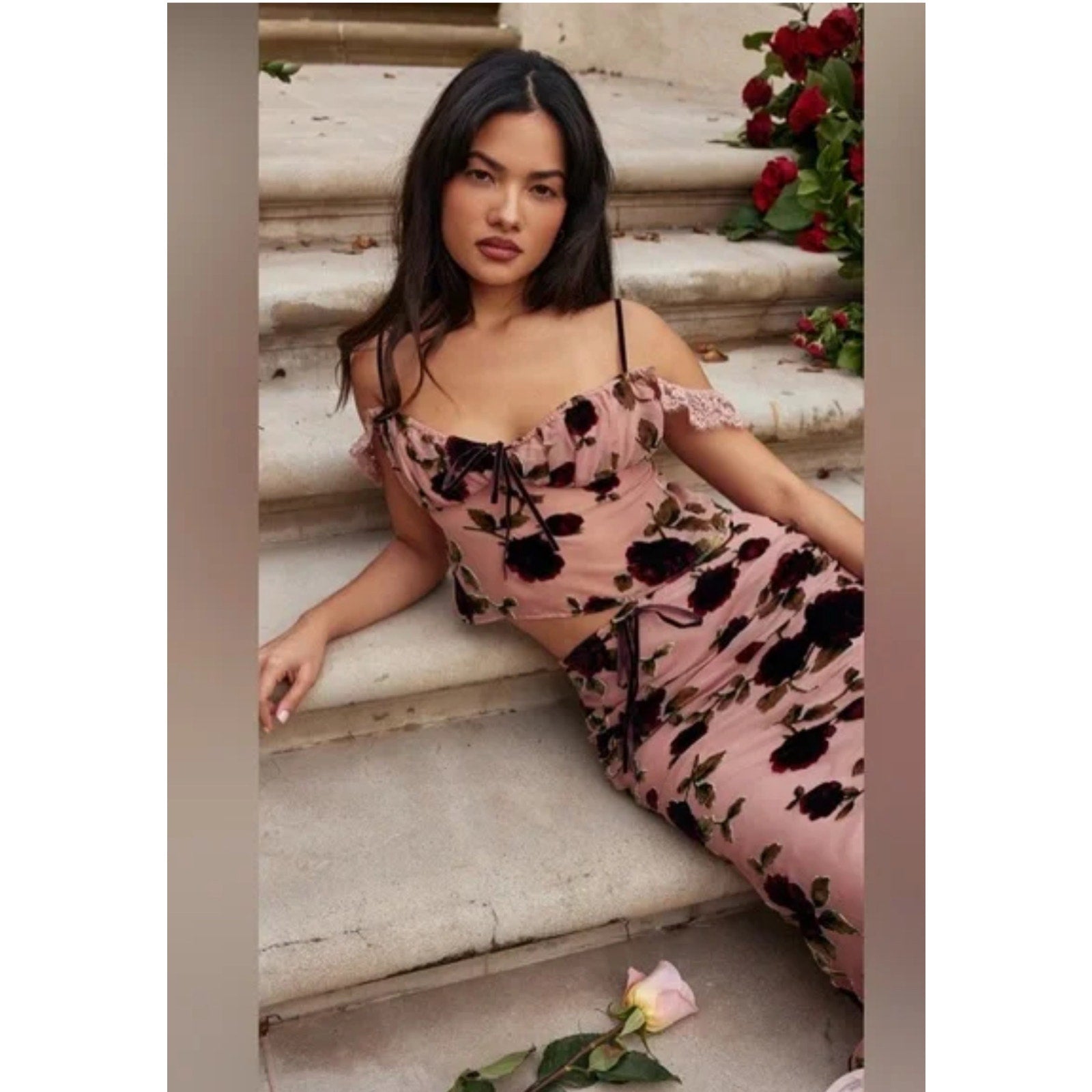 Gorgeously feminine, 'Graciela' is cut from a romantic dusty pink floral devore and we love how the soft gathered cups flatter the cropped silhouette. The delicate velvet ribbon ties and shoulder straps make for the perfect fit and the additional lace straps are ultra feminine. 'Graciela' hangs softly through the body and reveals a pretty open back with satin covered buttons. It's fully lined for comfort. Wear yours with the matching 'Imaan' skirt for pretty date nights. The 'Regular Cup' option suits cup size A-C whilst the 'Bigger Cup' option suits cup size D-E.