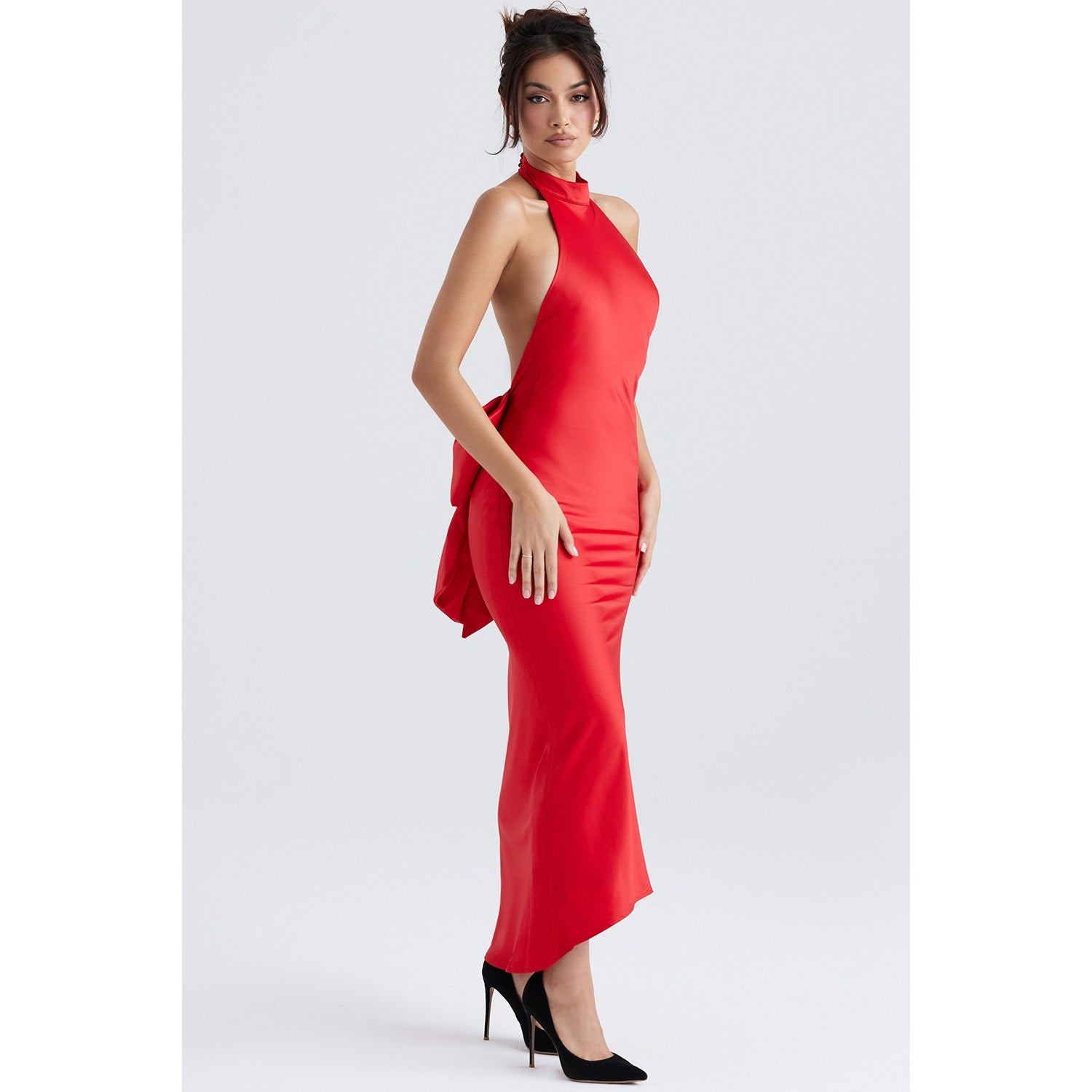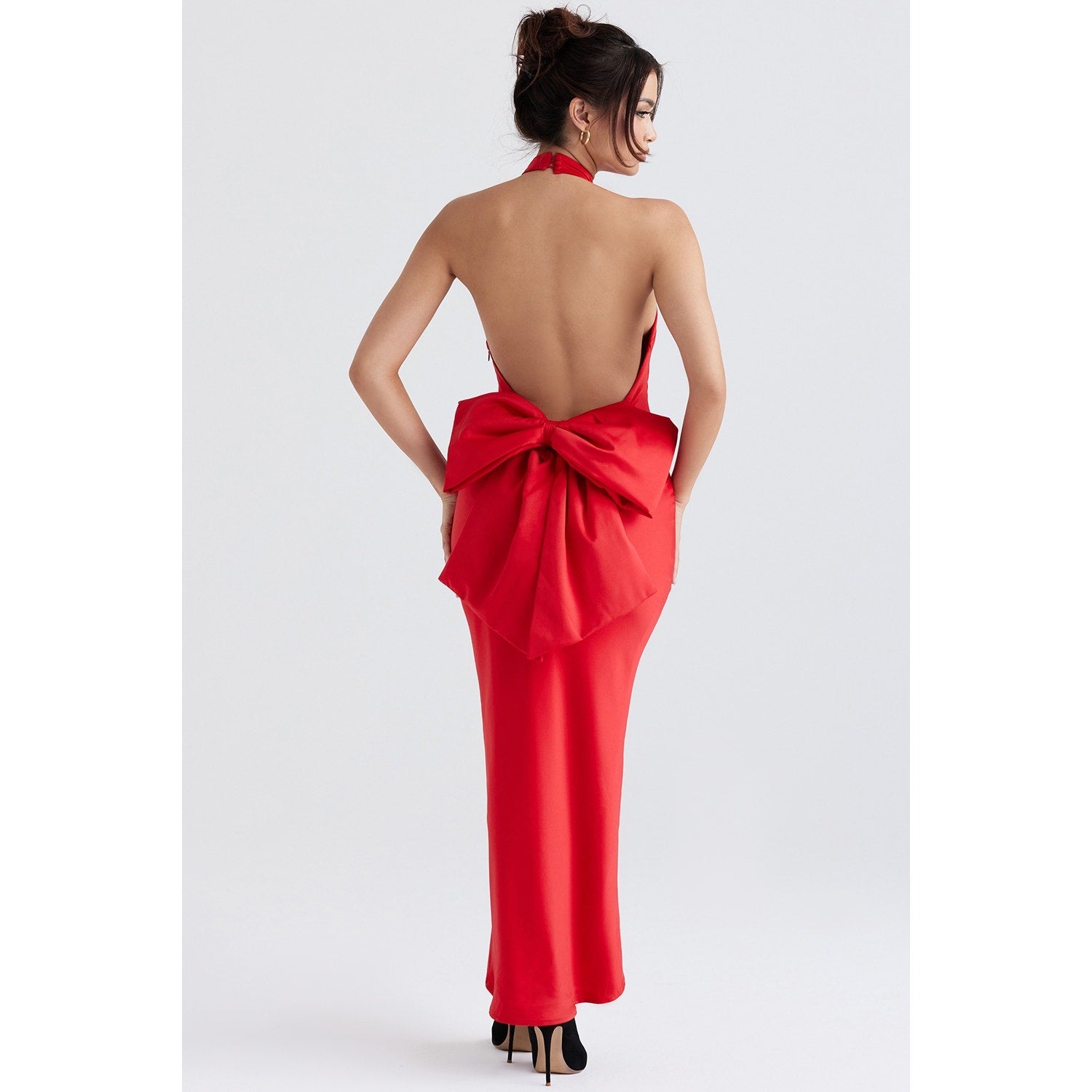 This dress is all about the drama at the back, with a low neckline and an oversized bow. "Ilaria" features a side zipper for easy dressing and is cupless and fits any bust size. Pair it with heels like our "Paris" scarlet satin heels .