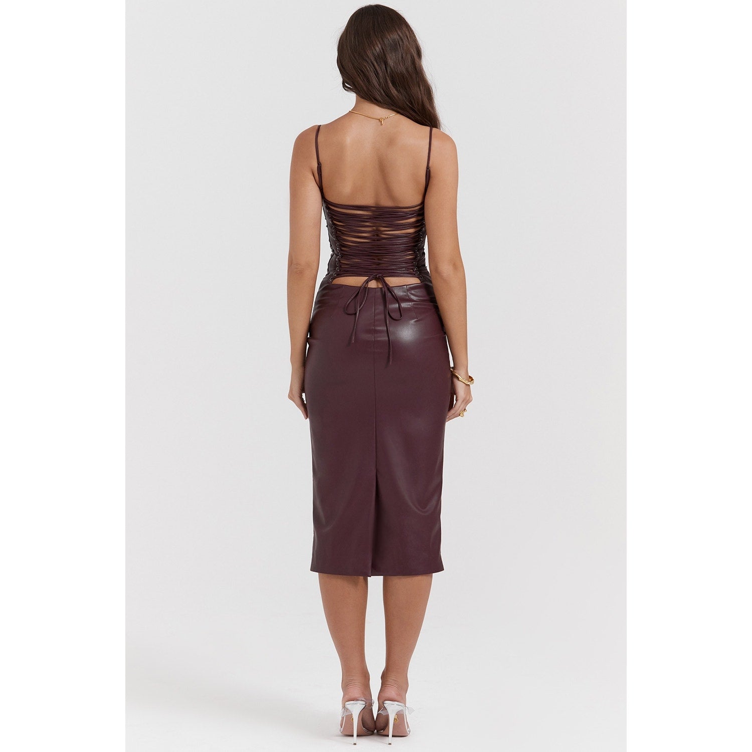 House of CB Jalena Mulberry Vegan Leather Lace Back Dress