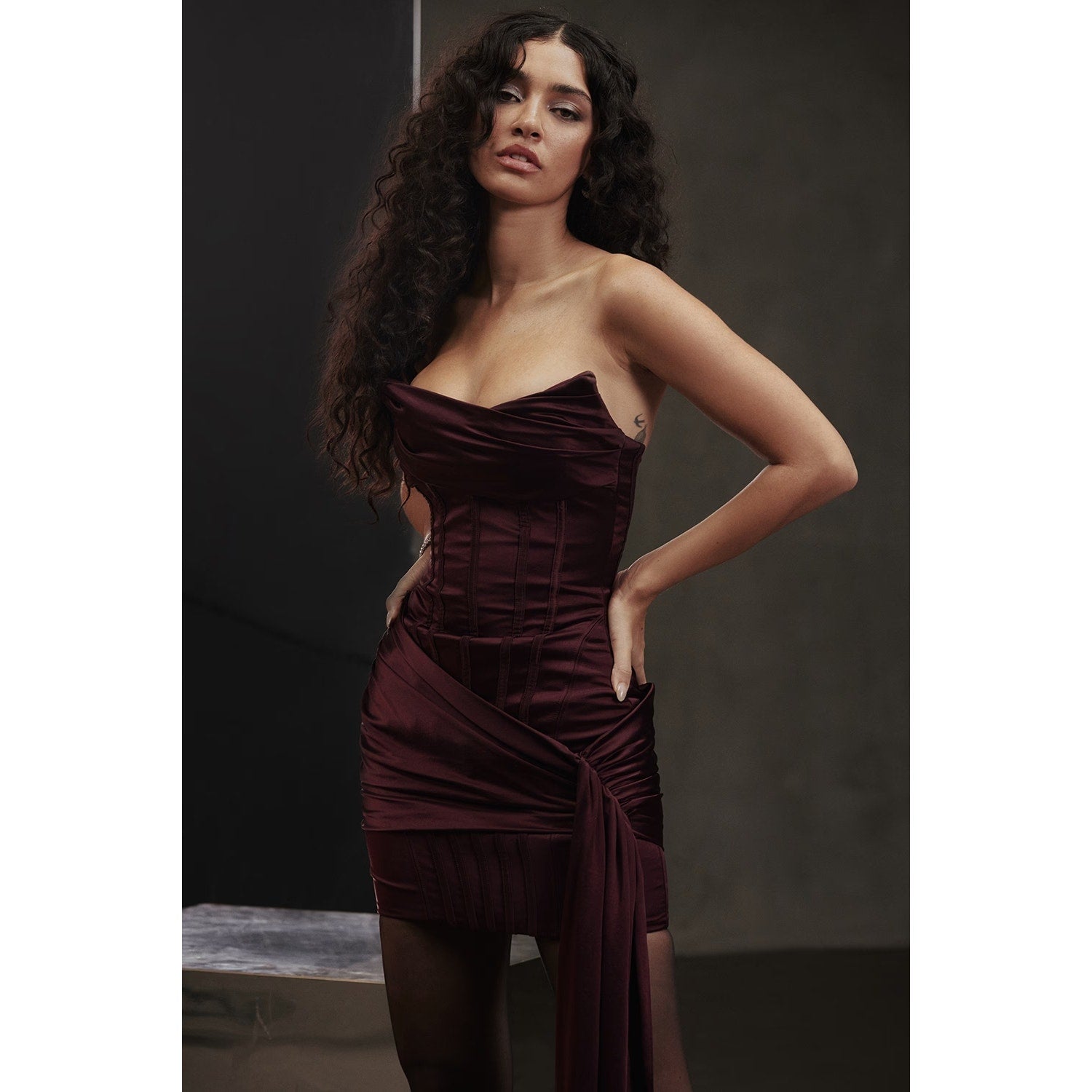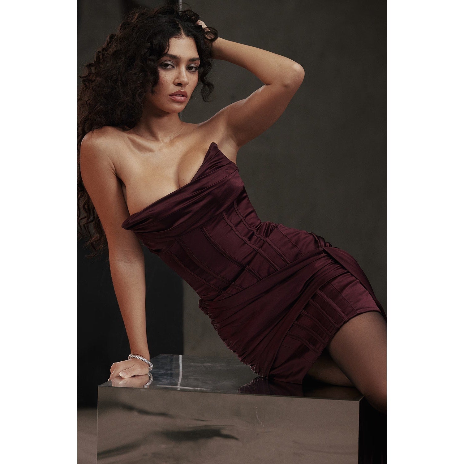 Our 'Loubella' mini dress is a glamorous work of art. Cut from lustrous mulberry satin, it has a flattering strapless neckline and the boned bodice is softened by the gathered skirt overlay and draped panel that falls effortlessly passed the hem, highlighting just how glossy the satin is. It skims over your curves and zips to the back for easy on.
