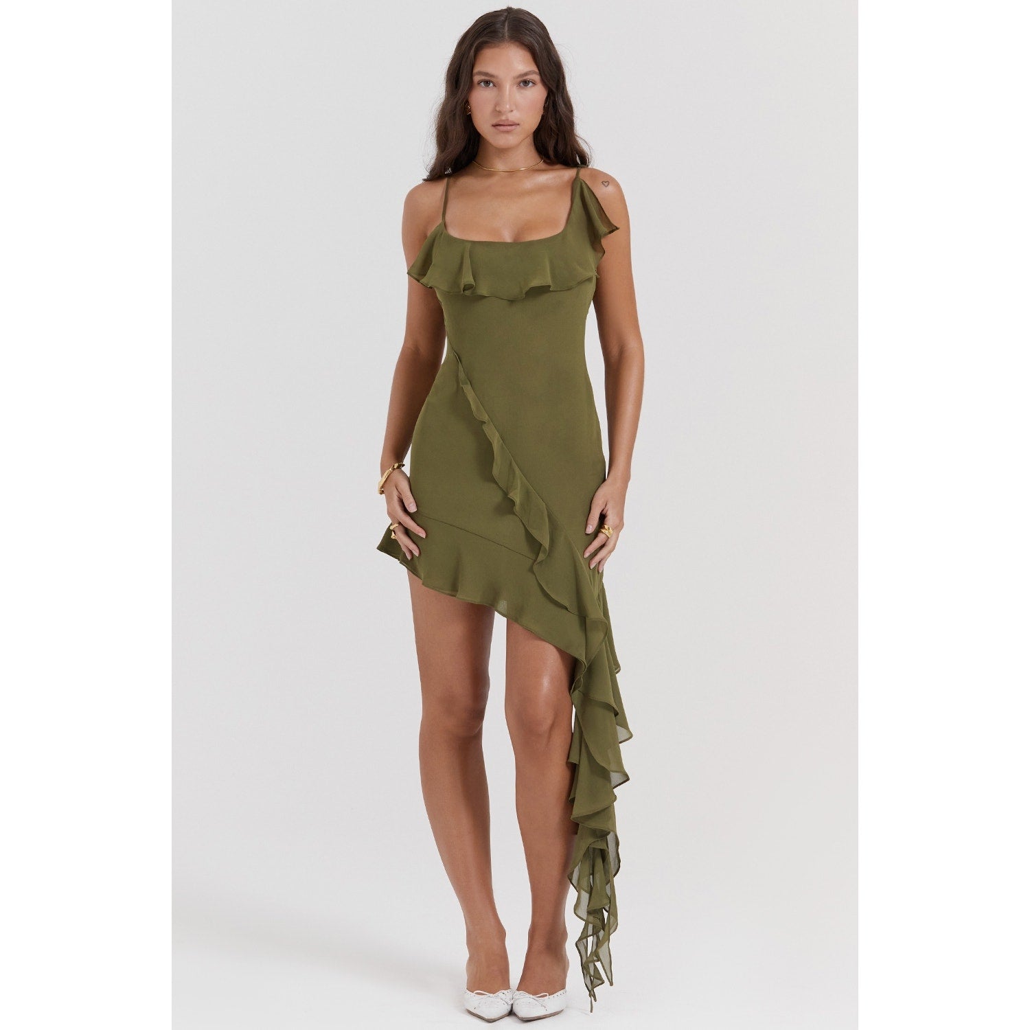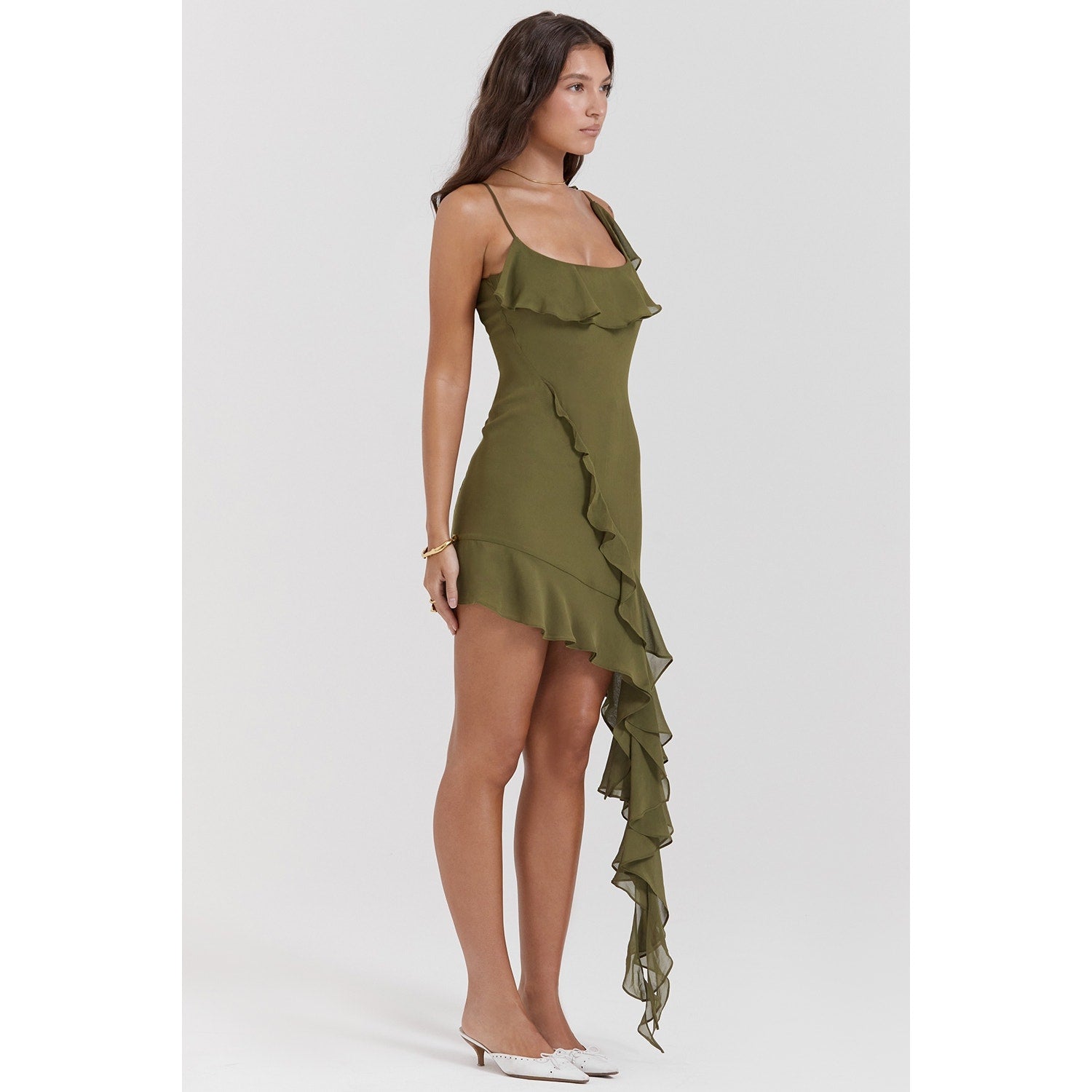 This gorgeous olive creation skims over your curves and is ruffled all the way along the floaty asymmetric hem. It zips to the side for easy on. Style yours with our 'Lucent' mules and a mini clutch for an evening of cocktails. Taller girls, we heard you and these are available in two lengths, our regular mini length and 2 inches / 5cm longer. Regular length : Approx 76cm and Longer length: Approx 81cm.
