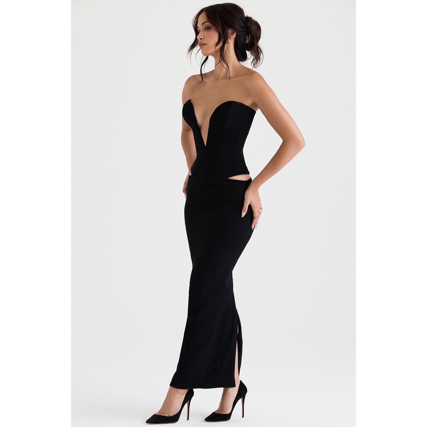 Perfect for any season, our 'Martinez' maxi skirt grazes the ankle in a flattering maxi length. Cut from stretch crepe in timeless black, it sits low on the hips and features alluring side cutouts to add a dash of daring. The figure skimming silhouette accentuates your curves and 'Martinez' is fully lined in a soft satin for a smooth finish. It has a zip to the back for easy on and a split at the hem for elegant movement. We think it looks ultra chic styled with our 'Lydia' corset and delicate heels.