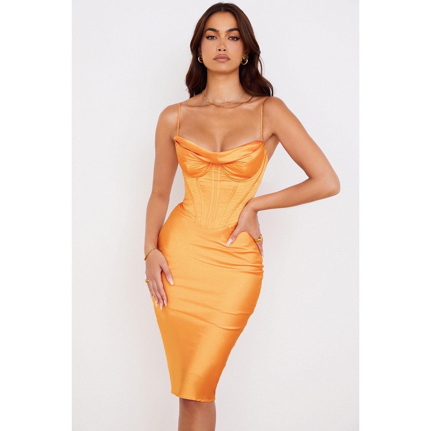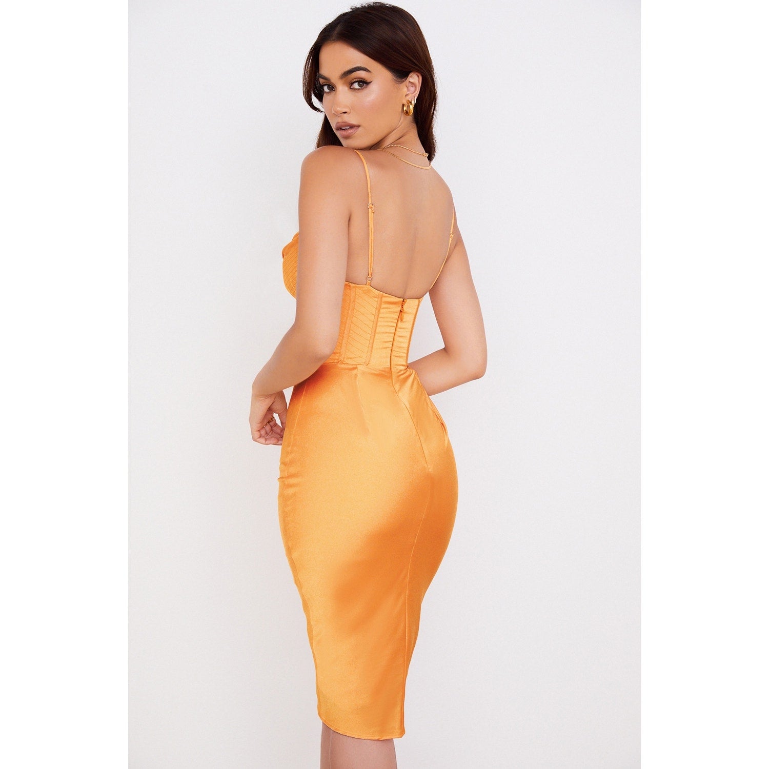 House of CB Myrna Tangerine Satin Corset Midi Dress