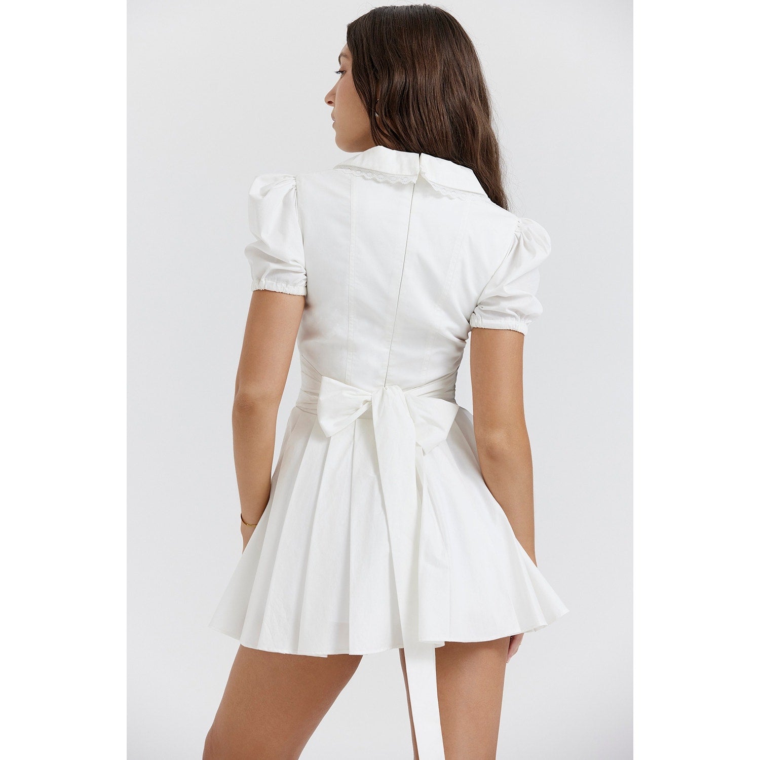 Cut from stretch white cotton, 'Piera' has a plunge neckline with a beautifully scalloped wide collar and pretty puff sleeves to add to the feminine feel and it's fully lined for comfort. The zip to the back makes for easy on and looks the prettiest paired with dainty heels like 'Lola' high heels in white.