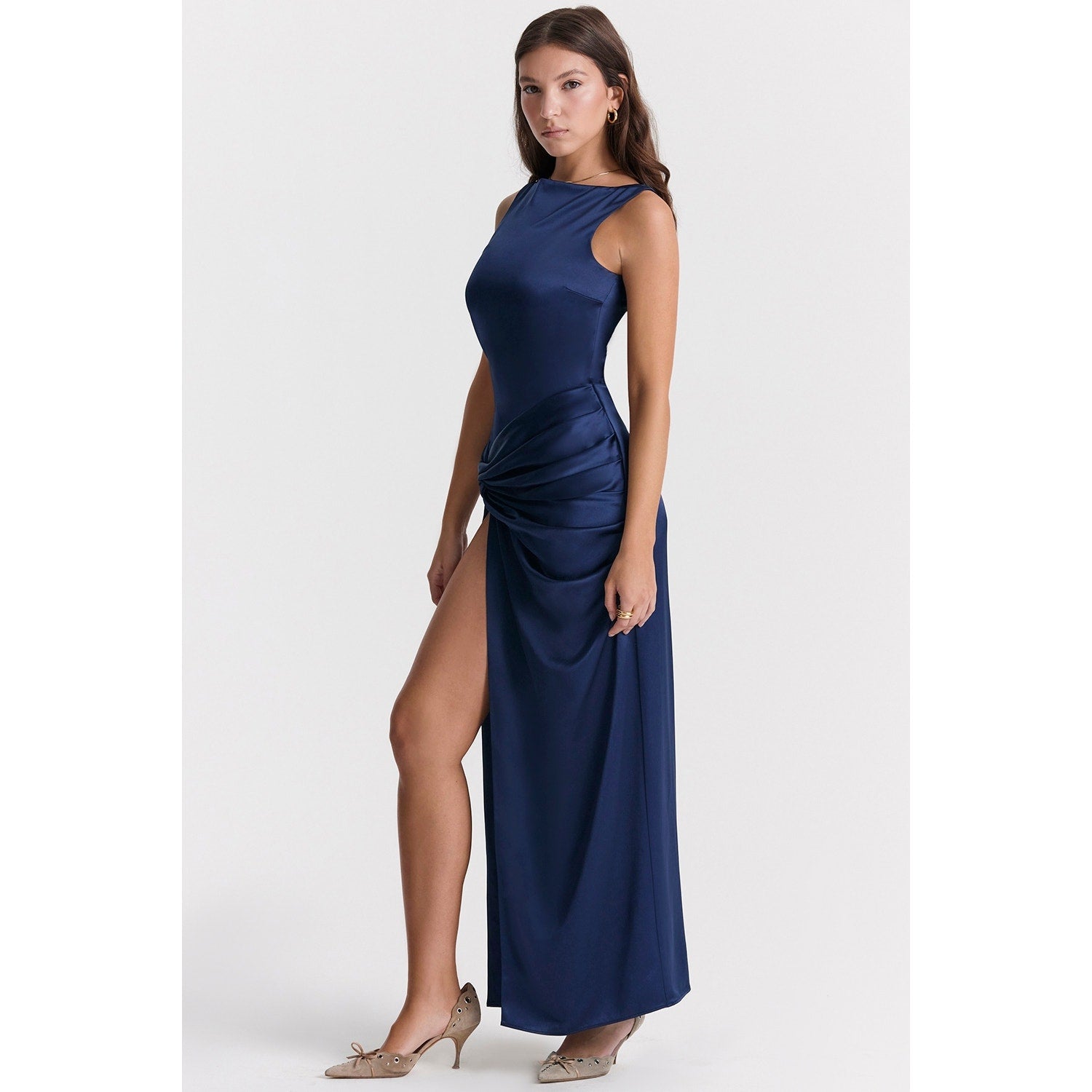 This glamorous dress would be perfect for any upcoming celebrations. 'Roxanne' is made from our lustrous silky navy satin and has a high straight neckline in a sleeveless cut. It features a gathered front with a flattering twist at the waist that subtly defines the elegant silhouette and drapes fluidly over your curves, finished with a thigh split for extra drama and revealing legs. 'Roxanne' is fully lined for smooth comfort and zips up the back for easy on. Wear yours with neutral heels like our 'Lucent' mules.