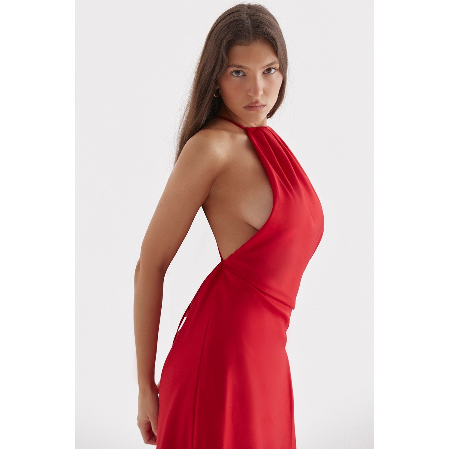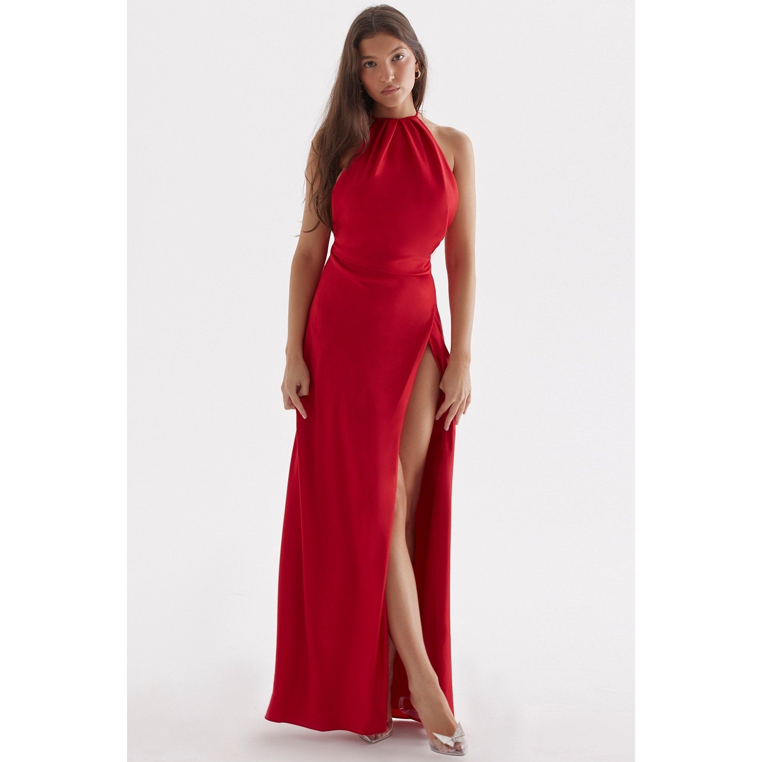 'Zanab' is all about languid, sexy dressing. It's cut from our luxurious lustrous satin for a fluid drape and has a halter neck cut, low back and is finished with a thigh split for extra drama. Team yours with sparkly pumps and wear when you want to make an entrance.