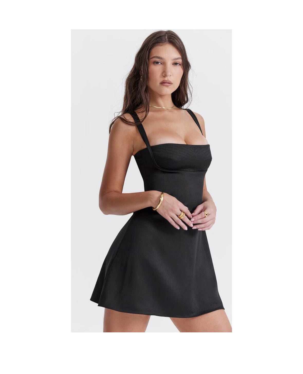 Feminine and elegant, our 'Kara' mini dress has a romantic feel. It's cut from our lustrous, ultra light duchess satin in timeless black that drapes effortlessly over your curves. We love the floaty feel to 'Kara' as it flares gently at the hem.