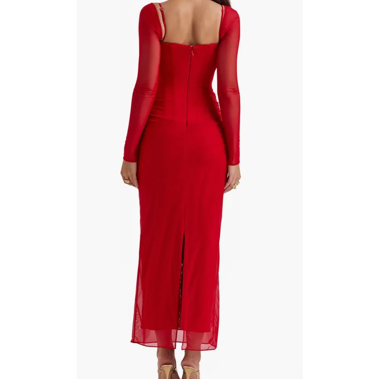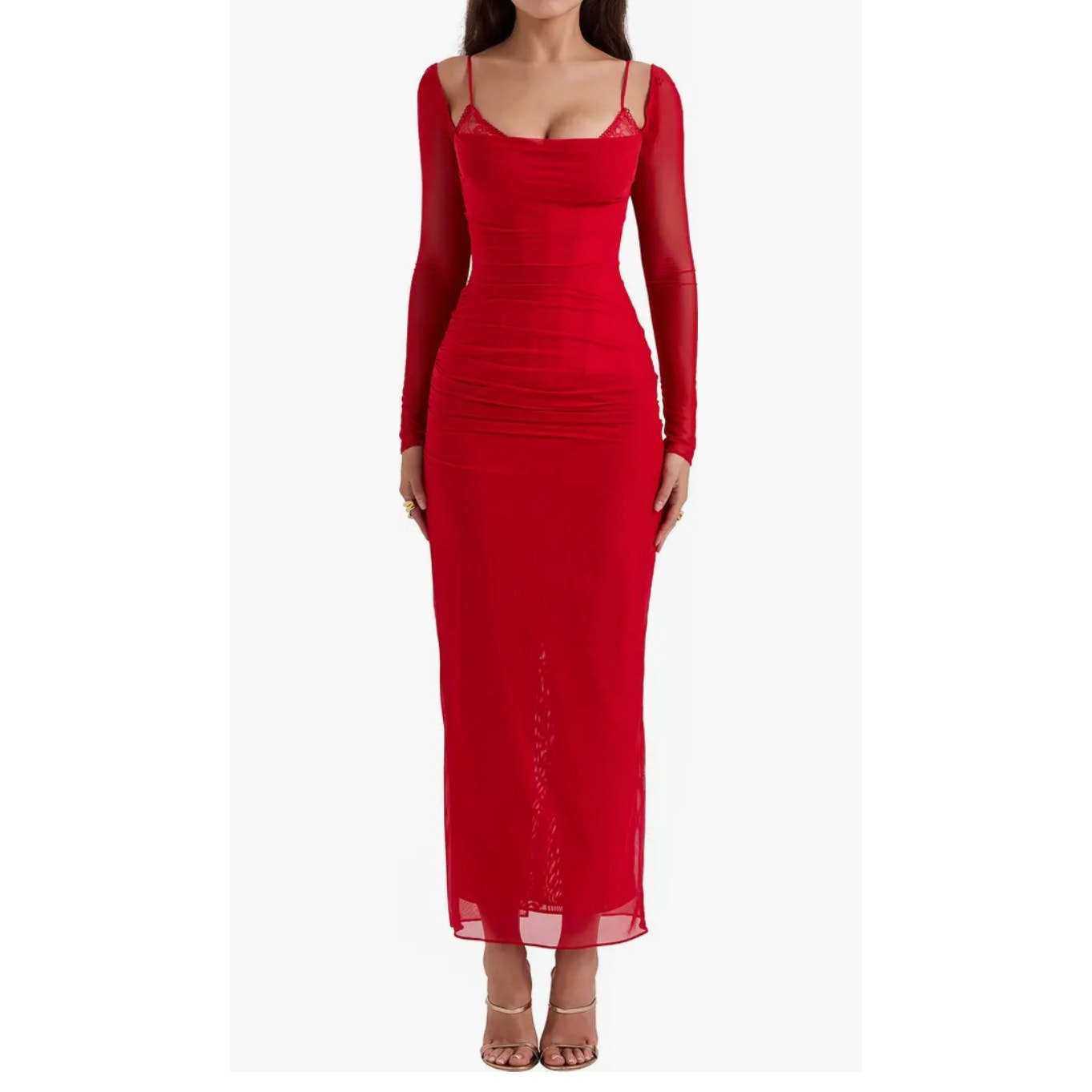 Shaped by rippled ruching, this close-fitting maxi features mesh accents and a lacy neckline.