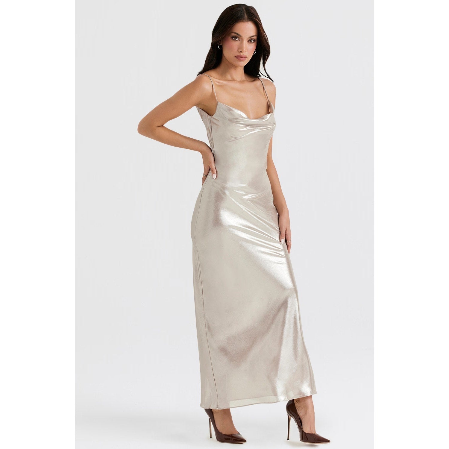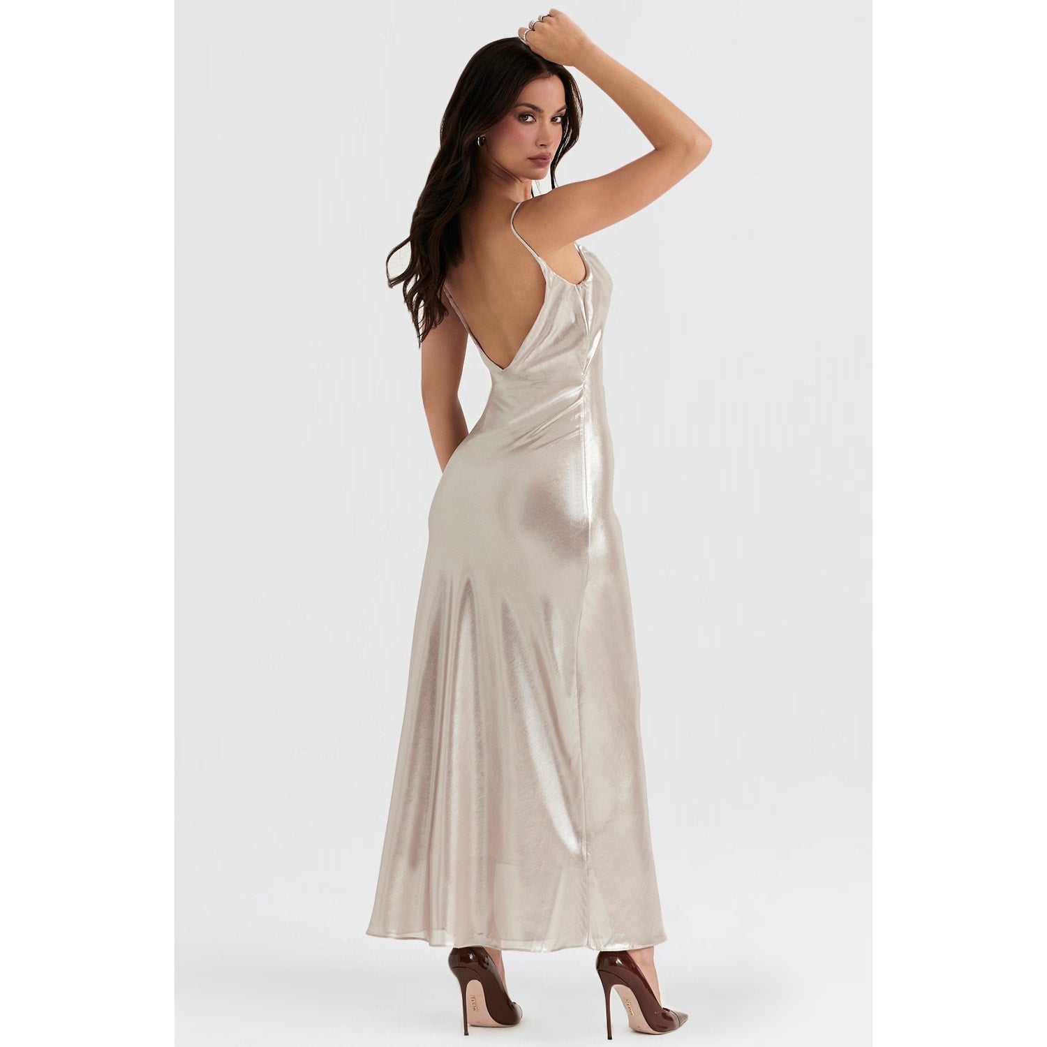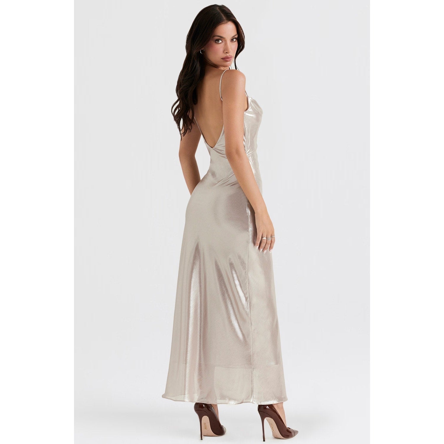 Leia champagne shimmer low back maxi dress Authentic