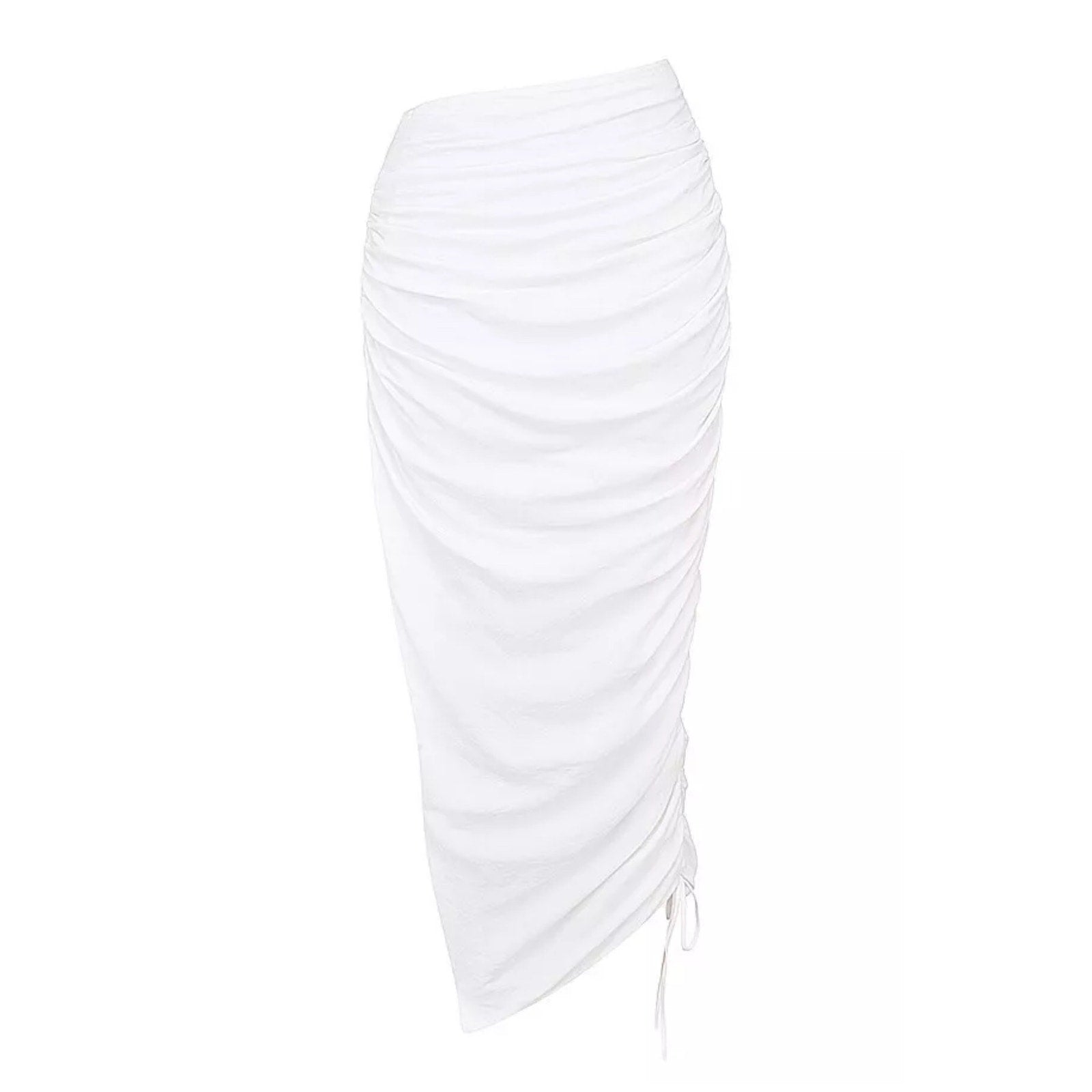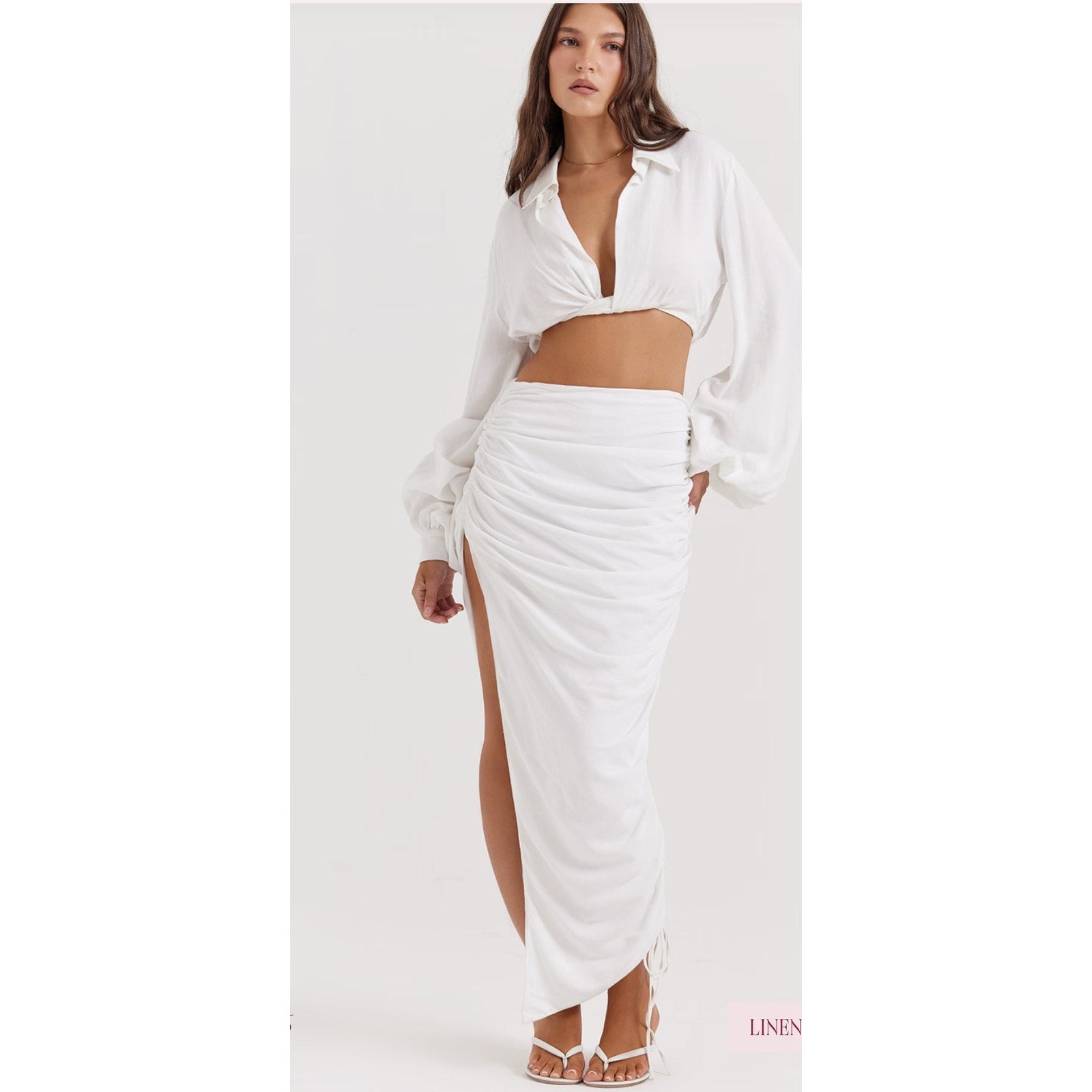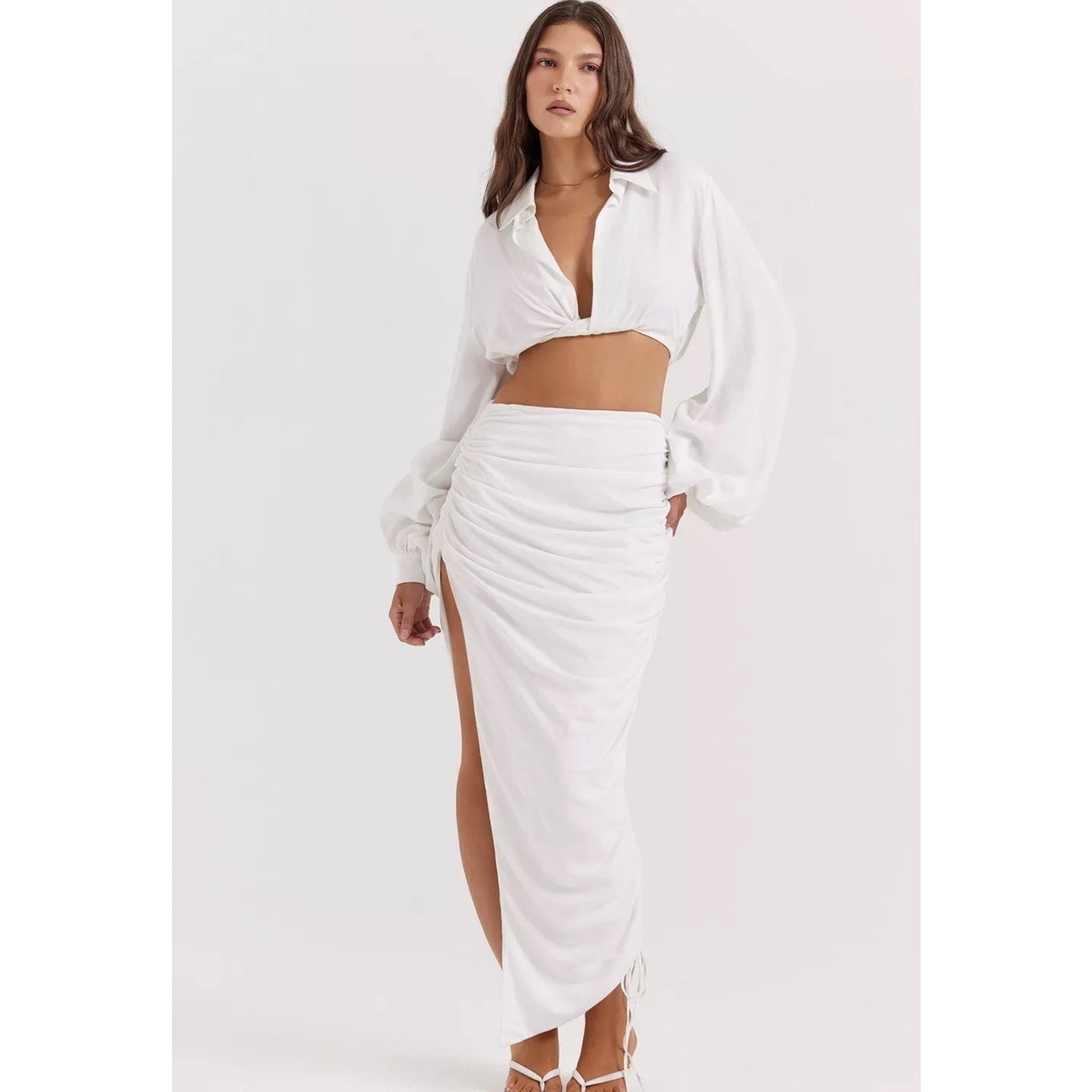 'Loie' ticks all the boxes for your next summer holiday. Cut from a lightweight textured linen, this ultra chic gathered skirt is the perfect mix of elegant and sexy with its figure skimming fit and side split that parts beautifully as you walk. The drawstring ties maximise the gather that adds to the pretty feel of 'Loie'.