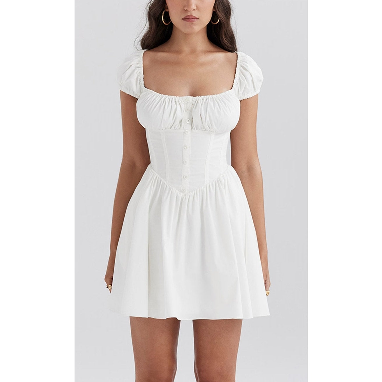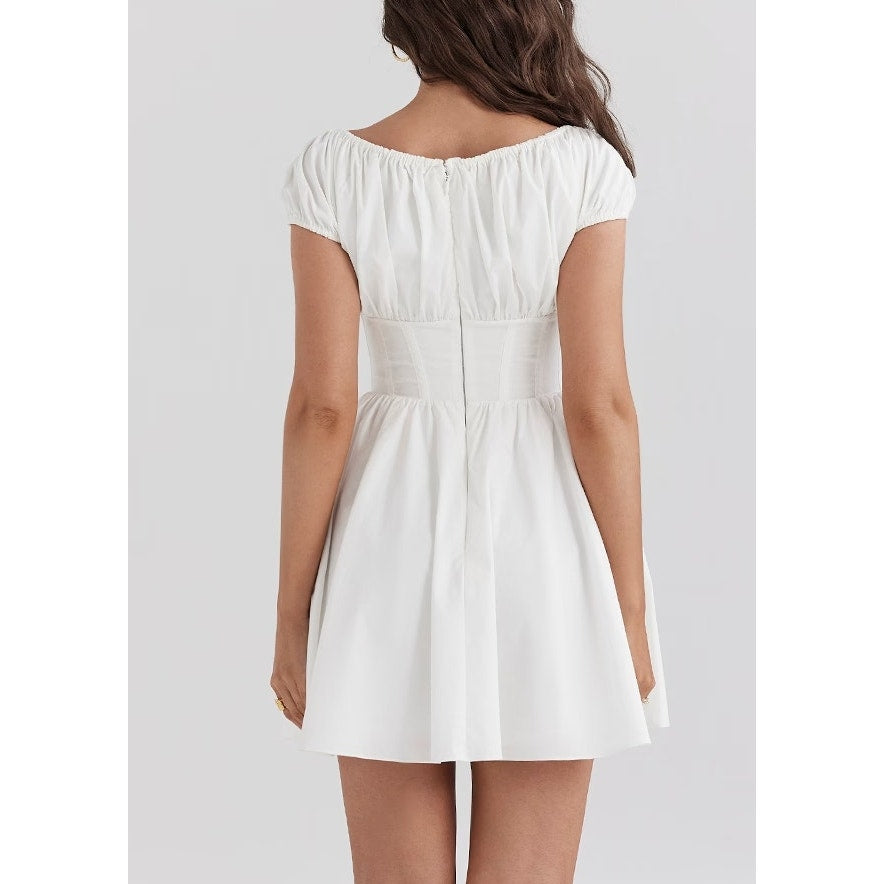 Our white mini dress is so dreamy, it'll take you through to the end of Summer and beyond. Cut from a cotton rich fabric that's blended with stretch, it has a dainty sweetheart neckline framed by a gathered bust and pretty cap sleeves. The corset inspired bodice features a button front and cinches the waist gently before falling to a voluminous mini skirt.