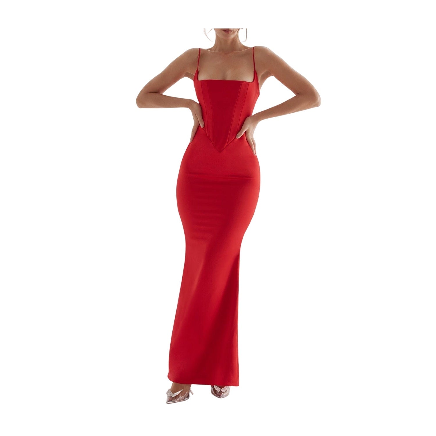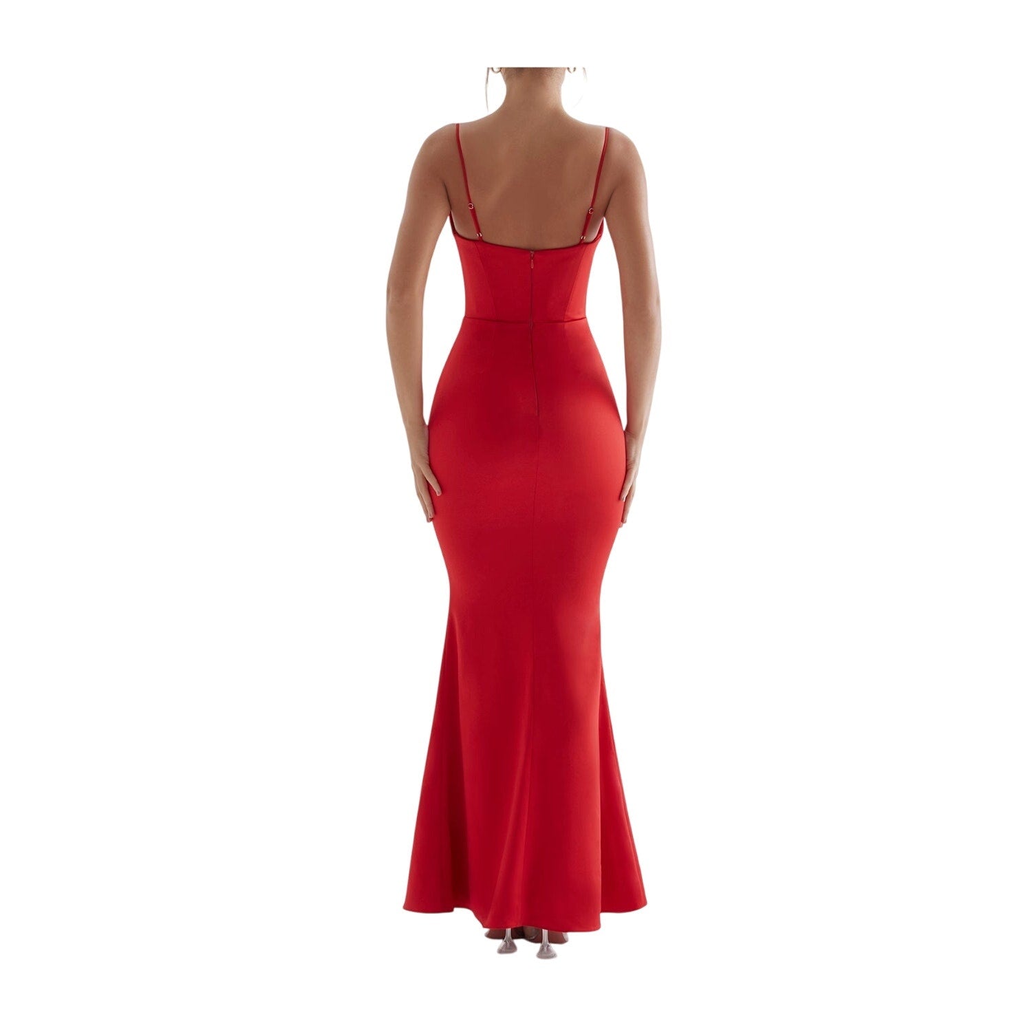 The bodice has a pointed hem that dips below the waistline and features our incredible corsetry boning to cinch the waist. The skirt is relaxed below the knee with an elegant mermaid shape that sweeps the floor in a flattering maxi length. It is fully lined for comfort and has a zip to the back for easy on.
