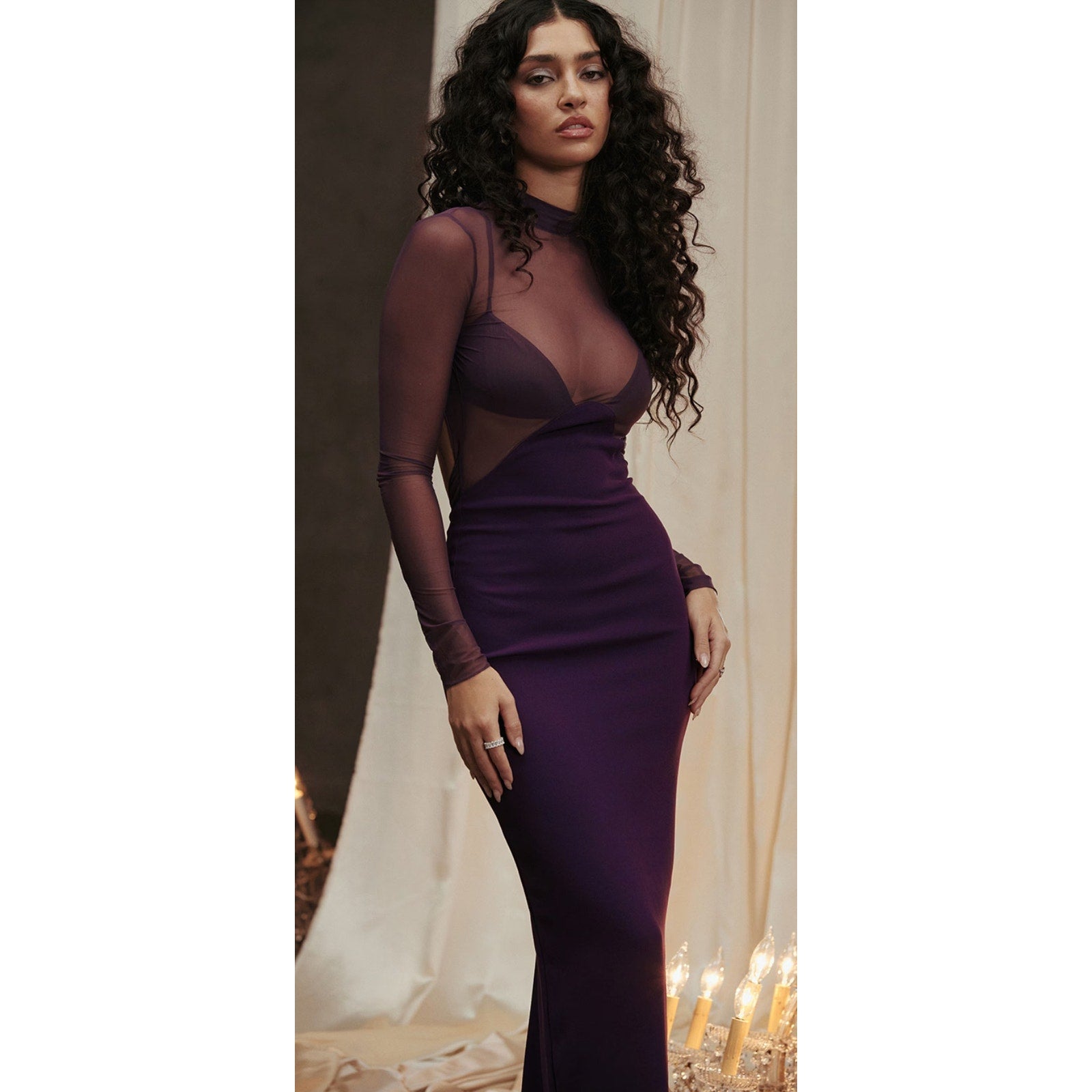 'Safiya' is your ultra flattering go-to dress this season that's full of feminine details. Cut from sustainable stretch crepe and sheer mesh in a Black Grape hue, 'Safiya' is the dress of all dresses. It has a high neck and backless silhouette that's underpinned with a detachable tonal bra so there's no need to worry about matching your bra with the dress.