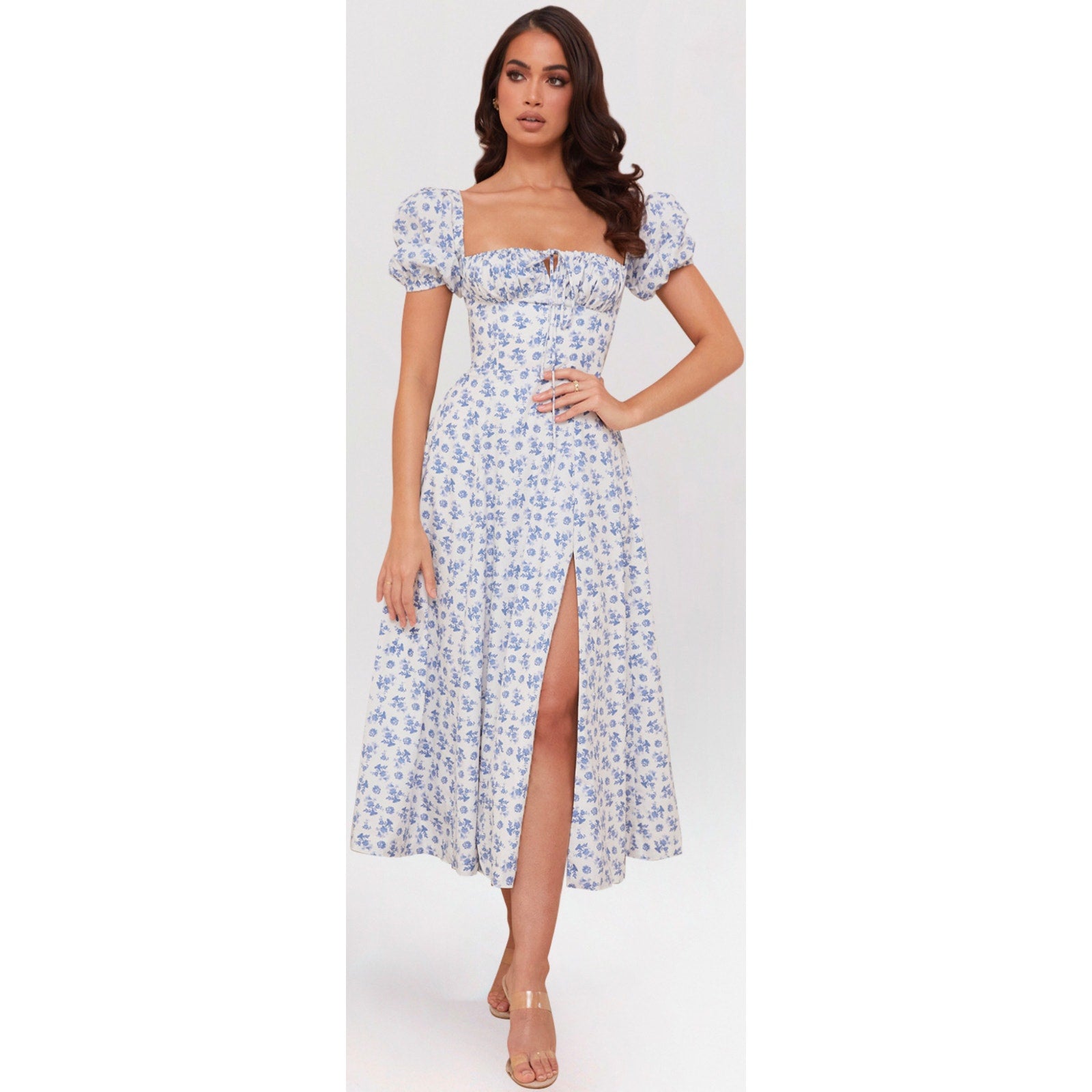 Tallulah's crisp fresh look has us dreaming of end of Summer trips. It's cut from our lightweight crepe for a fresh feel and is decorated with a pretty blue and white floral. The bodice has corsetry boning to the front, back and sides for that perfect cinched hourglass shape and the lightly shaped cups are lined for a comfortable fit. The pretty puff sleeves add to the fun and floaty vibe of Tallulah and we love the way that the side thigh split shows just a flash of thigh as you walk. 'Tallulah' is just perfect for girls who wanna be girls who wanna be sexy.