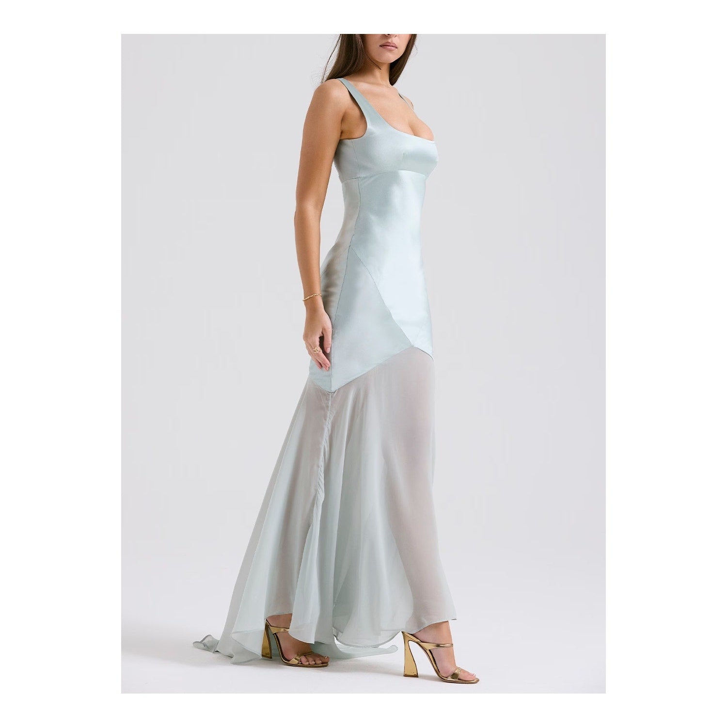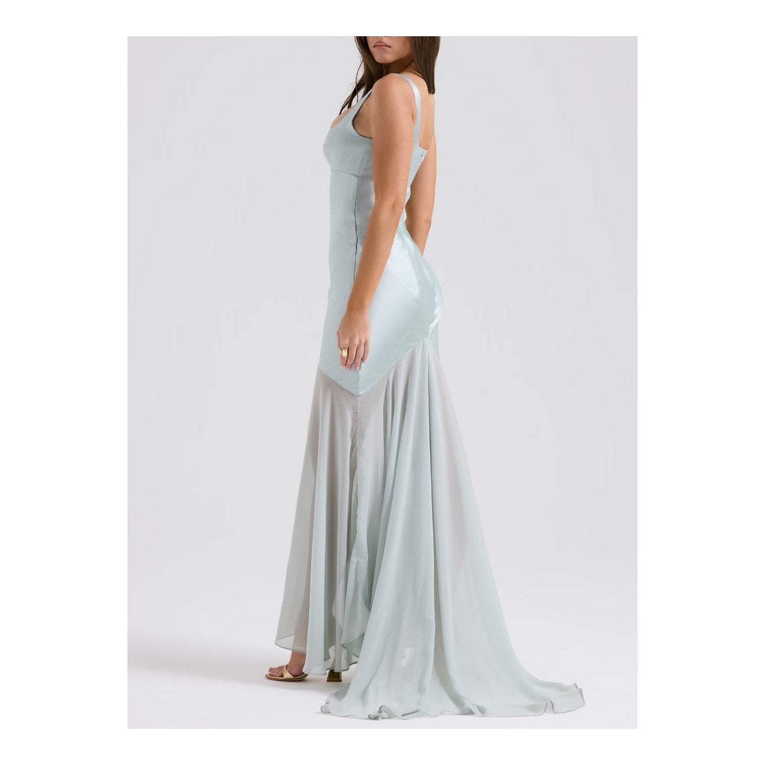 'Vittoria' has sculptural seams that flatter and gently skim your figure. The skirt is constructed from a beautiful chiffon for a floaty finish that turns to reveal a dramatic sweeping train, flowing elegantly behind you as you walk. Elevate this high-octane look with delicate heels and statement jewellery.